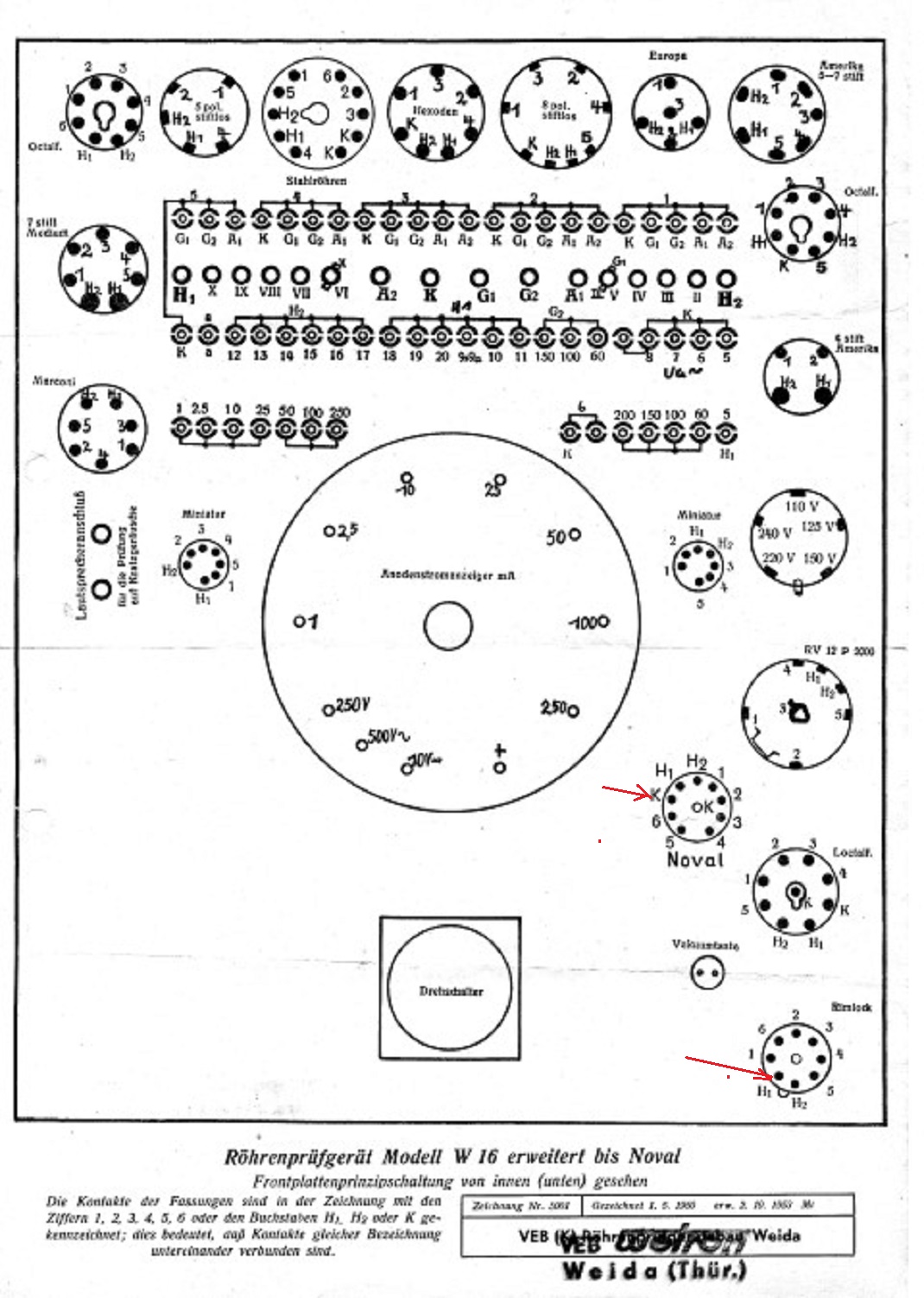 Um mich kurz zufassen, im Laufe der Jahre habe ich mich intensiv mit dem W16 beschäftigt und einige „Verbesserungen“ angebracht. Andere werden sagen, die Kiste wurde schwer „verbastelt“ ( oh je, der Wiederverkaufswert?). Wie dem auch sei, mit meinem RPG von 1938 kann ich praktisch die meisten Radio- oder TV-Röhren testen, selbst so komische Typen wie PD500, 6BN6 oder Nuvistoren. Klar, mit entsprechenden Zwischensockel und Emissionswerte, die von neuwertigen Röhren ermittelt wurden zur gut – noch brauchbar – unbrauchbar Beurteilung.
