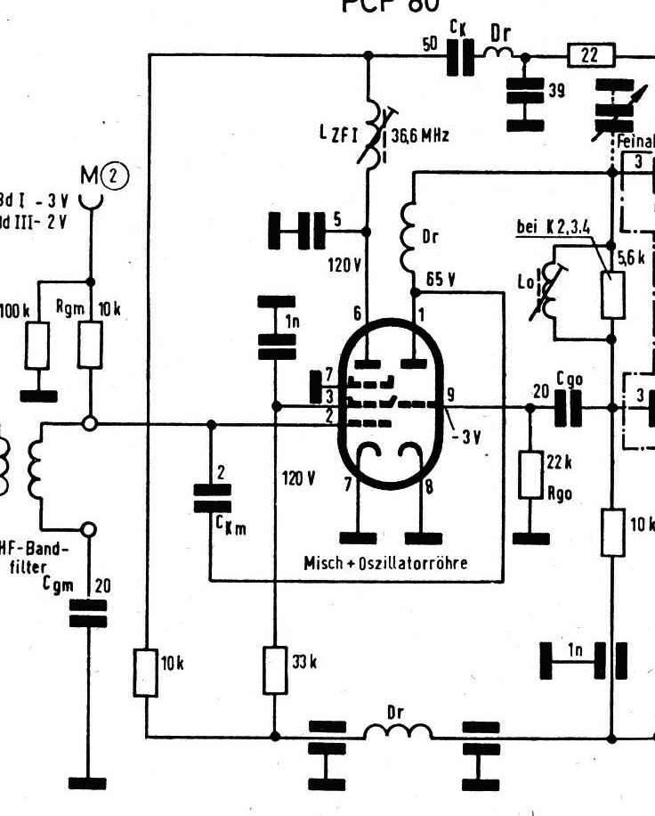 Wie heißt es so schön: Am Abend werden die Faulen fleißig, so auch ich. Hab mal in einem TV Schaltungsbuch aus der Zeit von 1964 reingeguckt. Es ging um die additive Mischung, die ja eine gekrümmte Kennlinie voraussetzt. Das heißt das der Arbeitspunkt der E(C)F nicht in der Mitte sondern im gekrümmten Teil sein muss. Die Oszillatorspannung muss im Verhältnis zur HF Eingangsspannung groß sein so das sie bis den positiven Teil der Ia - Ug Kennlinie reicht. Eine R C Kombination, ähnlich der eines Audion sorgt für den richtigen Arbeitspunkt. Man sieht das es einige Unterschiede zur Multiplikativen Mischung gibt aber keine echten Hindernisse.