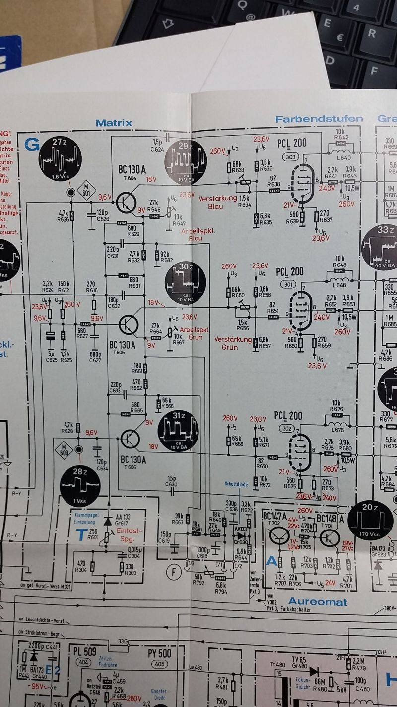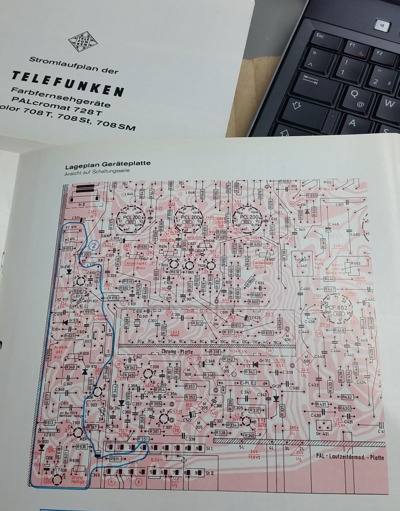 Nach dem Austausch der Kondensatoren in der Horizontalstufe ist das Bild jetzt nicht mehr geteilt und es steigt auch kein Wölkchen mehr auf von einem Widerstand. Ein Foto mit den Austauschkondensatoren und den Bezeichnungen im Schaltplan anbei. Jetzt fehlt nur noch die Farbe, das Bild ist weiterhin s/w. Ein Kondensator zwischen den PCL200 fehlt, die Nummer ist C623. Hat jemand die Werte davon?