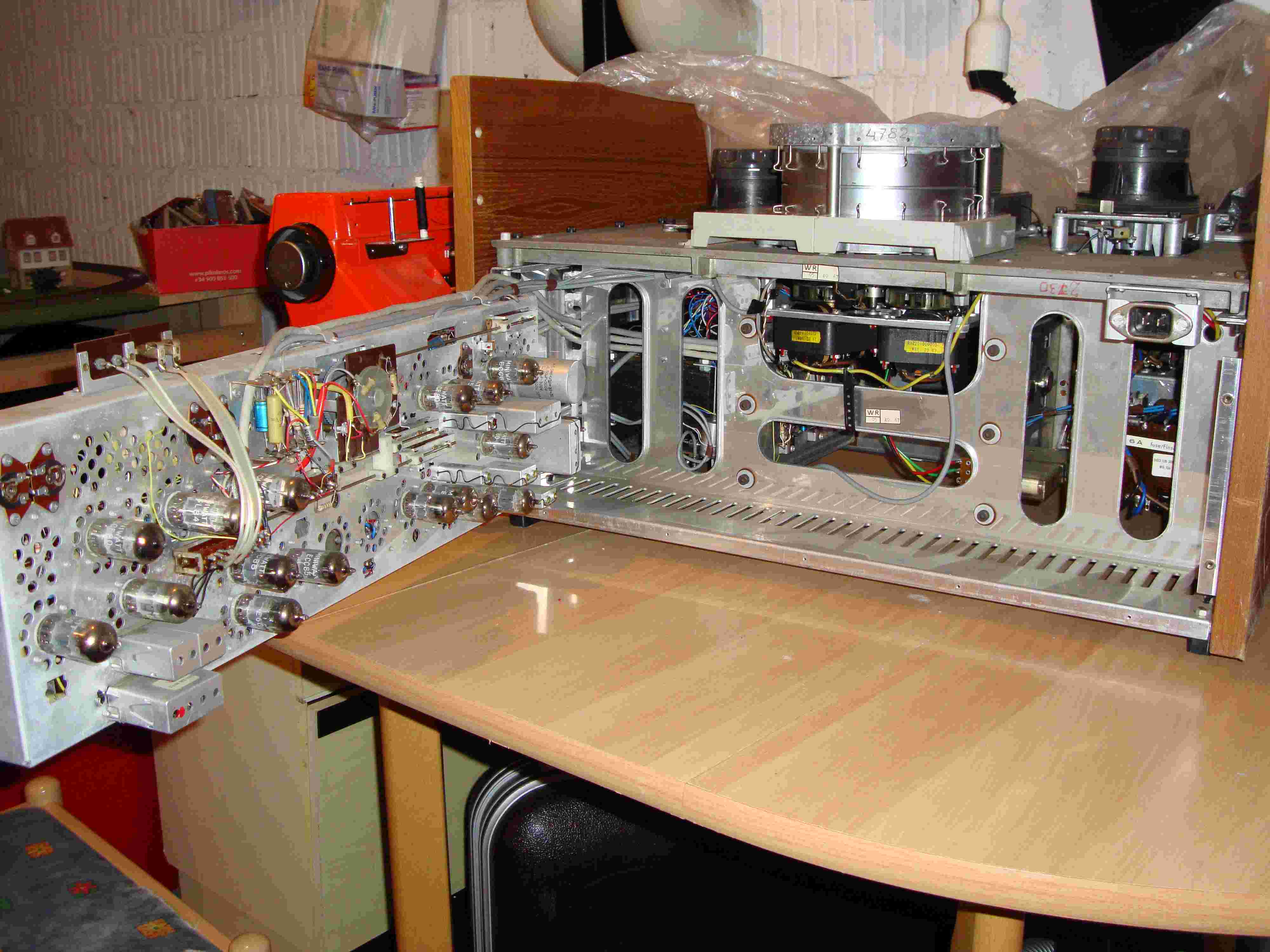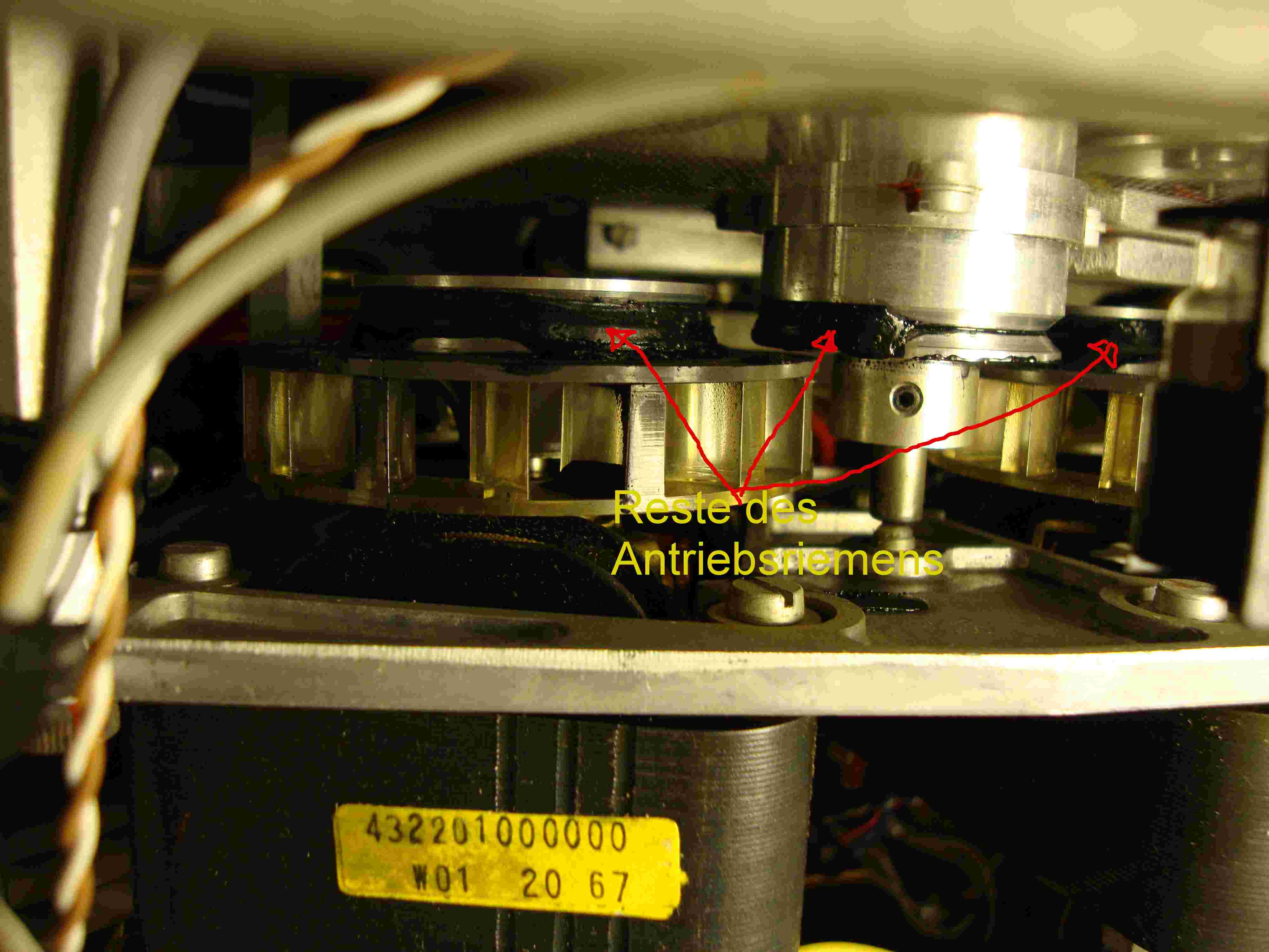 Teerartige Masse entfernt, ging ganz gut mit Isopropanol. Alle Antriebsriemen ersetzt, (3 Stück) Das Gerät mit regelbarem Trenntransformator behutsam und fraktioniert angeheizt. Keine Explosionen, keine heißen Elkos. Alle Röhren glühen (sieht aus wie beim Grillen), aber nur ein Lüfter läuft, ok kalte Lötstelle, geht jetzt. Alle Antriebsmotoren laufen (5 Stück).