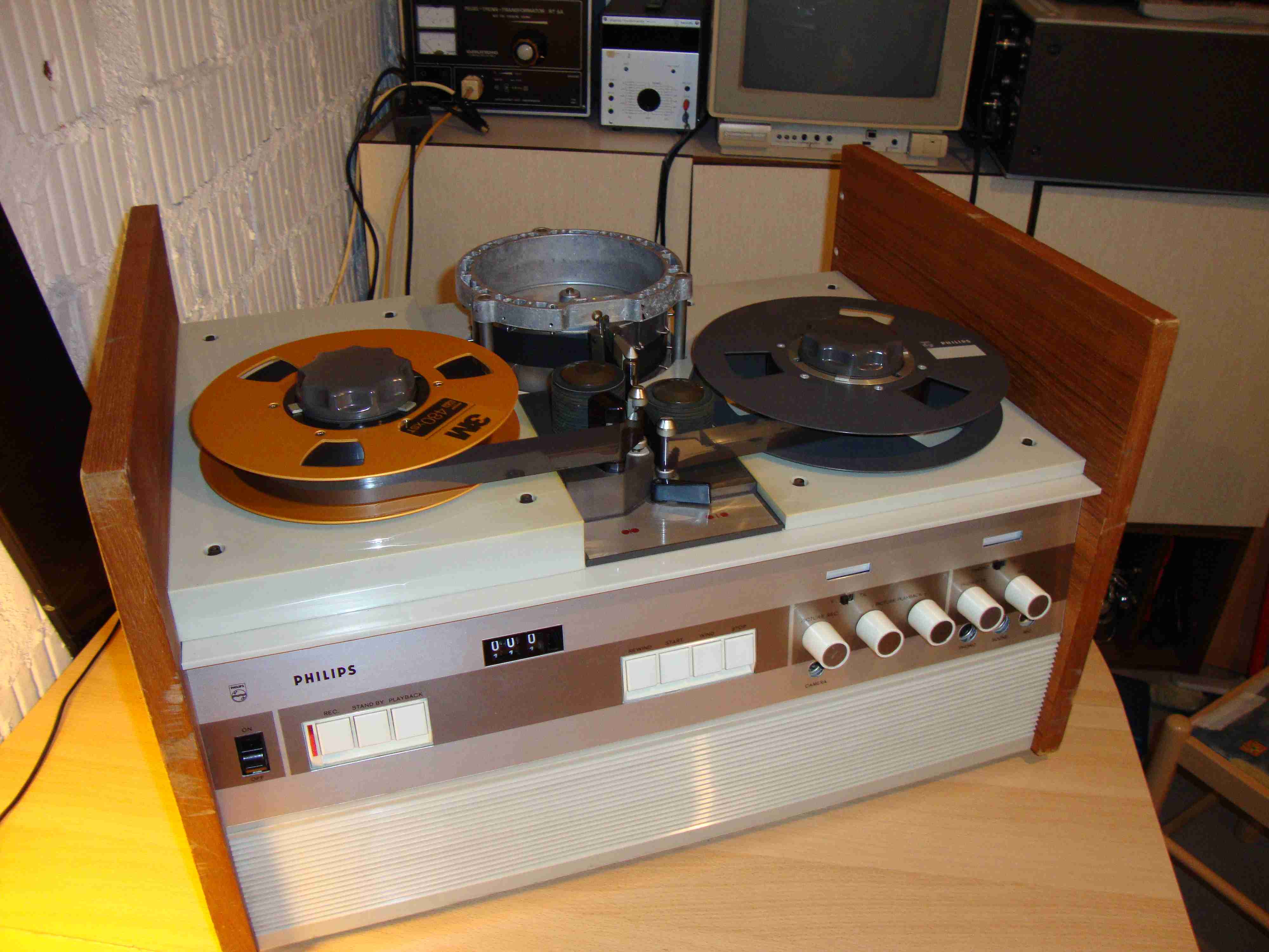 Nagelneues Band eingelegt und auf Start und Wiedergabe gedrückt. Der VTR hat die ersten Meter des Bandes regelrecht „gefressen“, Band zerknittert mit Schleifspuren. Nach aufwendiger Justage des gesamten Bandlaufs, Umlenkbolzen, Magnetköpfe und, einiger dieser sonderbaren Halterungen auf der Kopf- trommel (siehe früheres Bild von Kopftrommel) ist der Bandlauf nun einwand- frei.