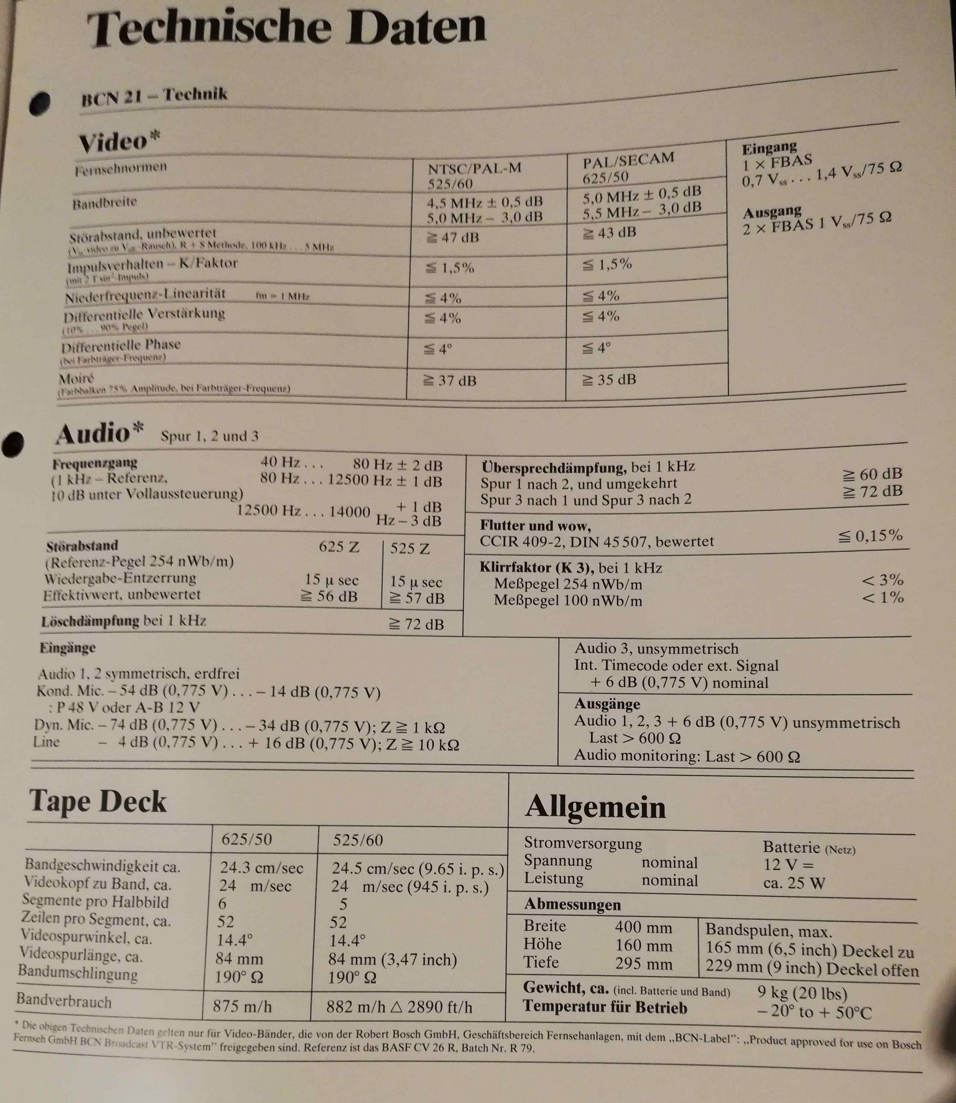 ich habe zur Bosch BCN21 noch Technische Daten gefunden, davon habe ich ein Bild gemacht, vielleicht ist das noch interessant. Ausserdem habe ich nocb Bilder von 2 VCR-Recordern von Grundig gemacht, den BK2500 und den BK3000. Mir ist noch eingefallen, zum Grundig VCR601 bzw. VCR621 habe ich noch einen passenden Grundig TC70 Time-Base-Corrector. Von meinen kleinen Open-Reel-Videorecordern habe ich ebenfalls Bilder gemacht, der Akai VT700 und eine Shibaden SV-610ED.