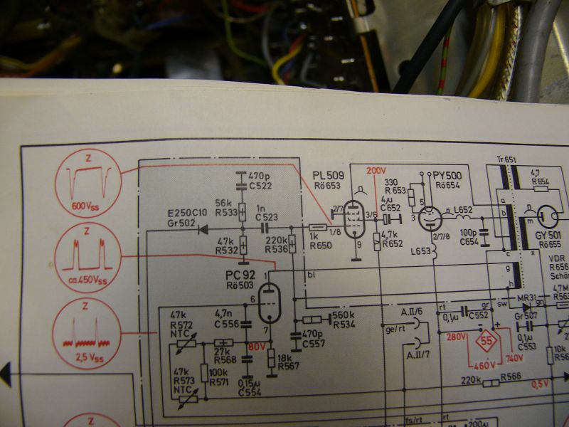 Die PL509 mit abgeklemmter Anode zu betreiben führt zur Überlastung ihres Schirmgitters. Und ob die PL504 und der Zeilentrafo auf die Dauer die Belastung mitmacht, vermag ich nicht abzuschätzen oder gar zu garantieren.