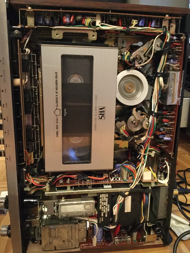 Ich habe die Mechanik vorsichtig freigelegt und das Antriebsrad manuell in Pfeilrichtung gedreht und siehe da, das Band (und damit auch die Kassette) wurde wieder freigegeben. Danach konnte ich das Gerät sogar einige male dazu bringen, das Band vom Vorbesitzer ganz normal abzuspielen - dank eines NTSC Video zu HDMI-Konverters, sogar mit Bild und Ton.