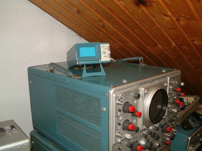 Kleinoszi mit Akkubetrieb, 1 Kanal und einer Bandbreite von 5MHz cal. kein Display sondern eine richtige kleine CRT. Ladeteil ist im Gerät enthalten, Kabel und Messkabel mit Tastkopf sind fest montiert.