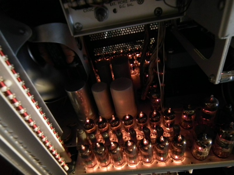 hier zeigt er übrigends die beiden Kettenverstärkerzüge, für jeden Kanal extra, ist ja ein echter Dual Beam. Das helle Licht kommt von den kleinen Penthoden, 6DK6