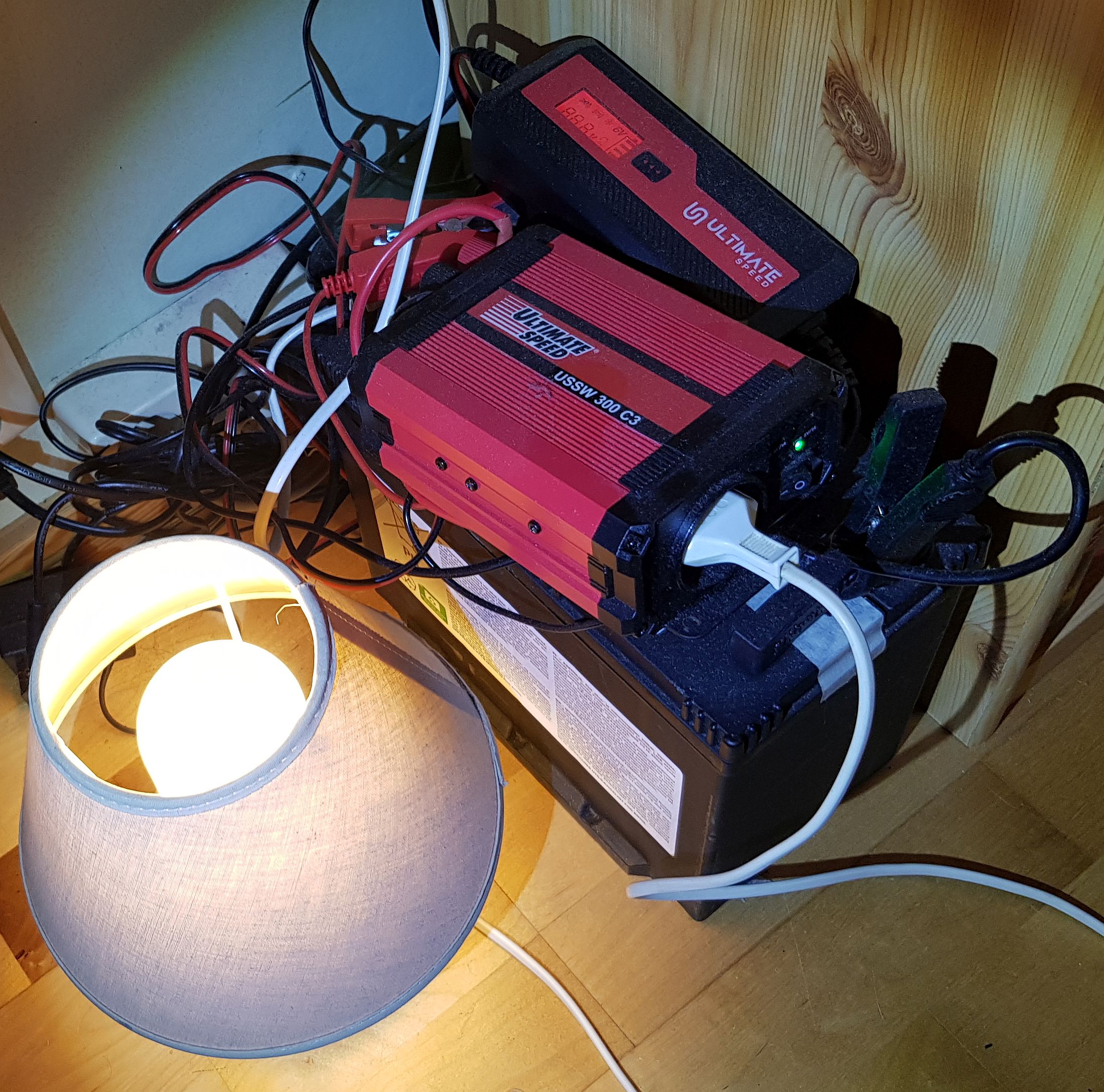 Hier noch meine einfache Notstromlösung für die Beleuchtung, die sich wirklich jeder leisten kann: Eine ausgemusterte Starterbatterie aus dem KFZ-Bereich. Fürs Auto bereits unbrauchbar, für Notstrom aber noch wochenlang ausreichend. Aufladen lässt sie sich notfalls immer wieder per Starthilfekabel. Dazu ein günstiger Wechselrichter mit modifiziertem Sinus – völlig ausreichend, um ein paar LED-Leuchtmittel zu betreiben, die genug Licht liefern. Kerzen sind auf Dauer eher frustrierend: zu dunkel und schlechte Luft. Lüften will man ja auch nicht ständig, wenn die Heizung ausgefallen ist. Und dann ist da noch die Brandgefahr durch Kerzen.
