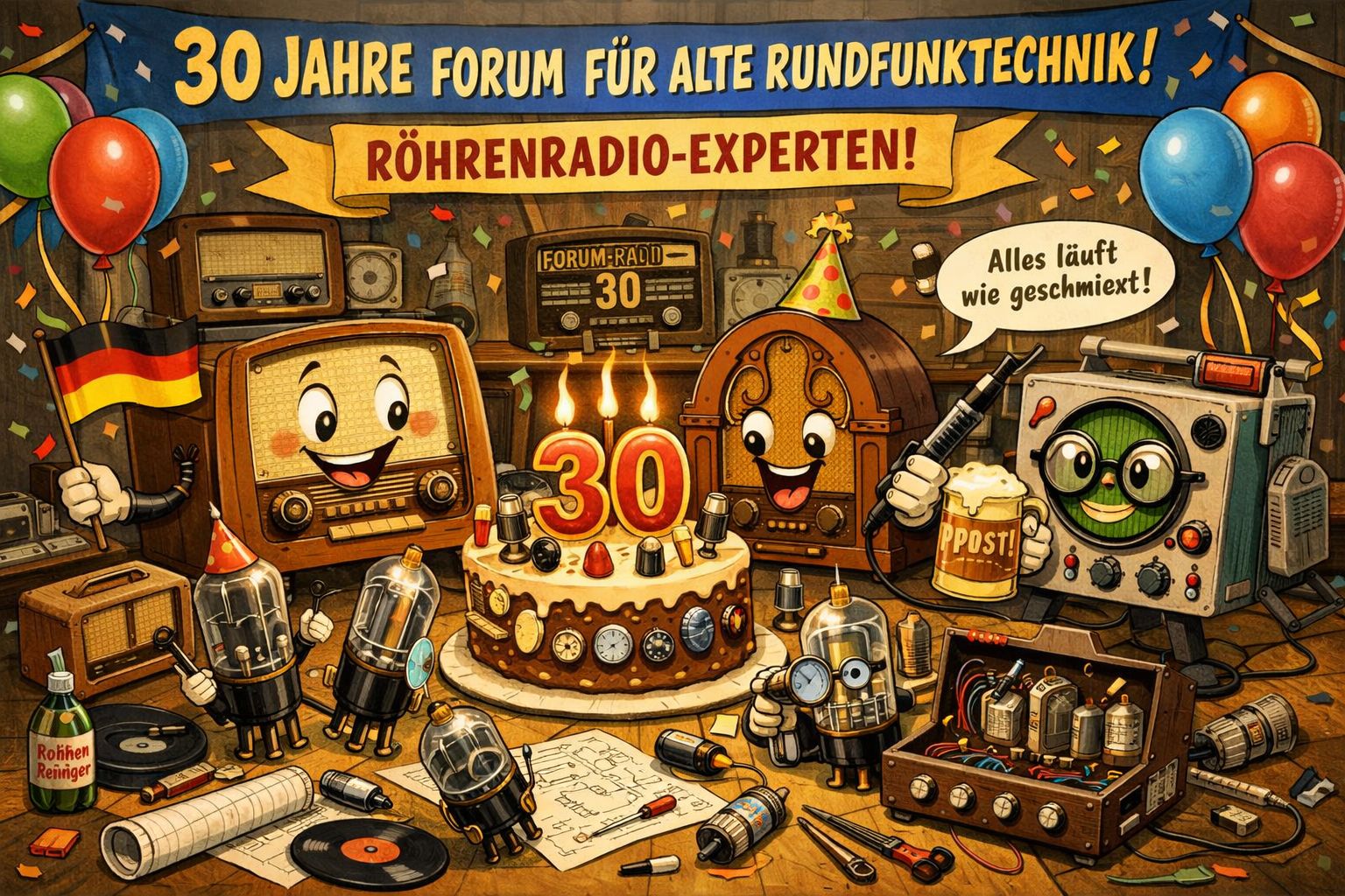 (Grafik von ChatGPT mit dem Prompt "Erstelle ein lustiges Bild zur Gratulation des 30-jährigen Bestehens eines Forums über alte Rundfunktechnik und der Restaurierung und Reparatur insbesondere alter Röhrenradios." erzeugt.)