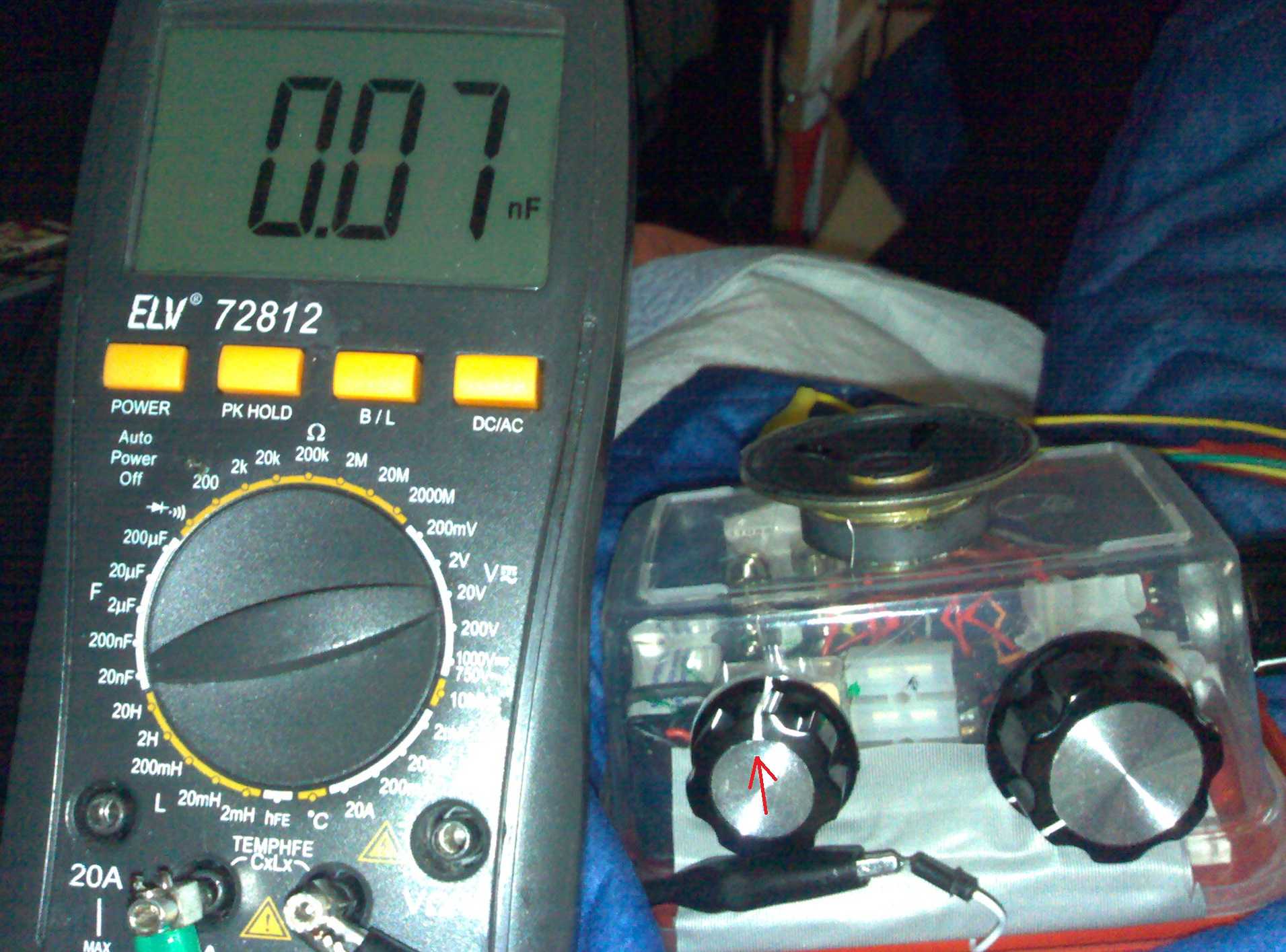Hallo Yvonne-Ester, deine Mühe lohnt sich, es wird nun klarer. Das Messgerät habe ich auch. In dem kleinsten Messbreich 20 nF ist die Anzeige in 10 pF Schritten und der wirkliche Wert kann deutlich abweichen. Mein Gerät zeigt 4,7 pF mit Null an, bei 8,2 pF schwankt es zwischen 0 und 1 und ab 10 pF zeigt sich die 1 stabil. Das wäre ja nicht schlecht für das obere Bandende, wenn die Anfangskapazität deines Drehkos kleiner als 10 pF ist.