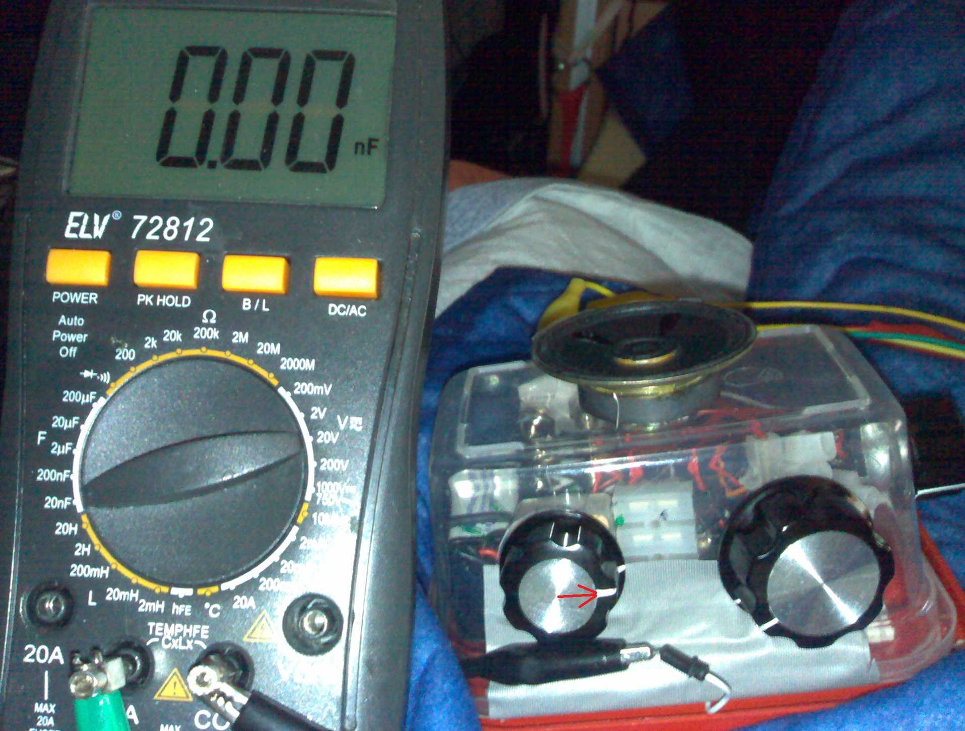 Hello Jan Erstmal kurz zur Beantwortung Deiner Fragen Ich gehe davon aus, dass weiter Interesse besteht, mit den originalen Bauteilen auch Mittelwelle möglichst im gesamten Frequenzbereich zu empfangen. Ja, natürlich, ist mein Interesse. Zu den Messungen: siehe Anhang. Die Ca kann etwas niedriger als 10 pF sein, manchmal flackerte hinten 0,01 anstatt 0,00 auf, bleibt dann aber wirklich bei 0,00 nF stehen. Gemessen an von der Steckplatine getrennten Drehkokabel, verbunden dann mit grünem und gelben Krokokabel zum Meßgerät, siehe Bild 001. Wie wurden die Frequenzbereiche ermittelt? 3 Methoden: Mit der angeratenen Koppelmethode mit einem Zweitradio, mit einem Schaltkreis-ZN414/TA7642-Vergleichsempfänger mit gleicher Spule (wie der Franzis MW-Empfänger) und drittens Vergleich empfangener Sender mit nach meinem Standort regenerierter Liste empfangbarer MW-Sender auf fm-scan.org. Die Ferritantenne braucht nicht unbedingt eine zusätzliche Drahtantenne, diese sollte schwach gekoppelt werden (Begründung siehe voriger Beitrag). Doch eine Drahtantenne + Erde brauchts dringend, sonst ist Nachts keinerlei Empfang von Stationen über 25 Kilometer möglich. Welche Induktivität misst du zwischen Spulenabgriff und dem anderen Ende der Spule? heißes Ende - Abgriff (ca. 20 Wdg. vor kaltem Ende) mHenry 0,191 Abgriff - kaltes Ende (ca. 20 Wdg) 0,024 mH heißes - kaltes Ende (gesamt) mH 0,273 Lässt sich mit dem Drehko + allen Parallelkapazitäten überhaupt eine Konstellation finden, die die ganze Mittelwelle überstreicht? Nein, ich habe es im Austausch des 100 pF Basis-Emitter-Kondensators mit Ersatz von 6,8 pF bis hoch zu 1 µF probiert. Der Überstreichbereich des Drehkos blieb immer in der ersten Hälfte des MW-Bandes.