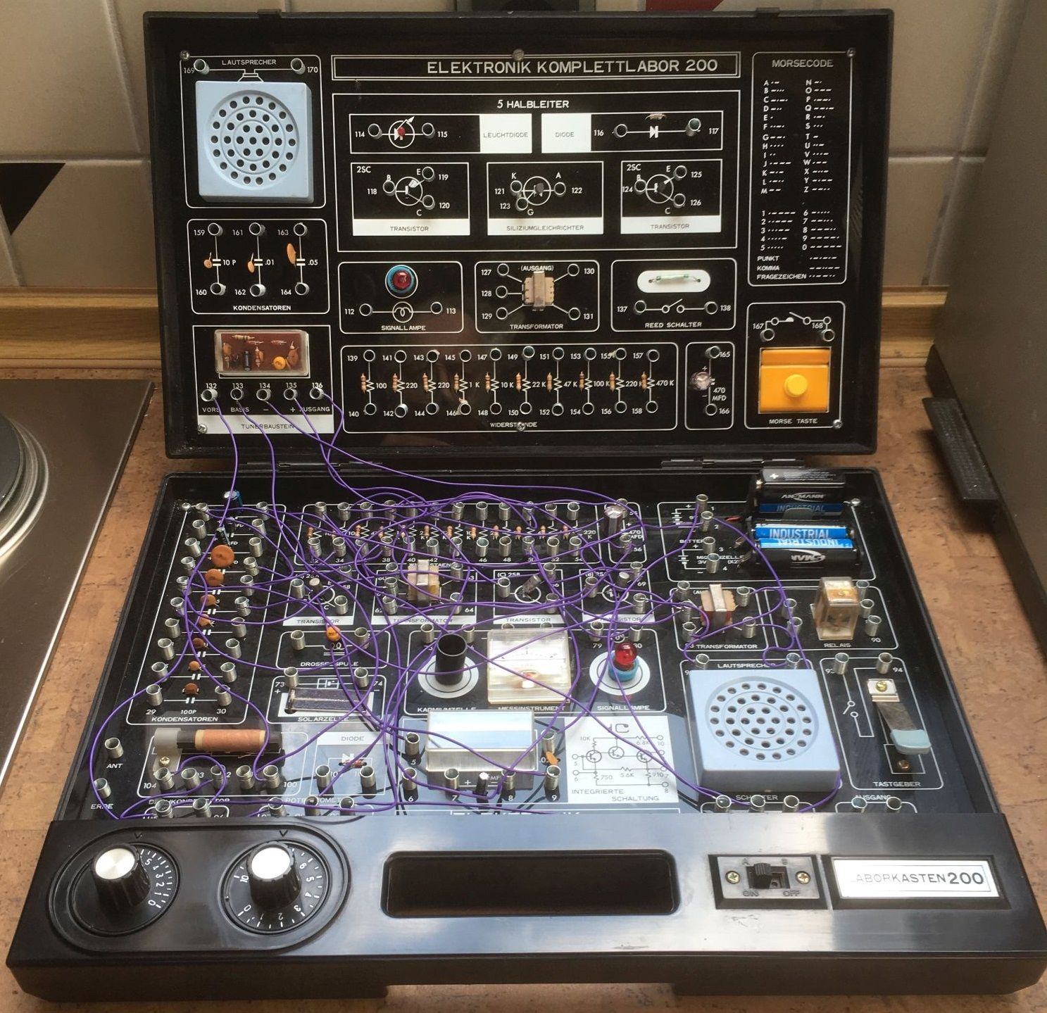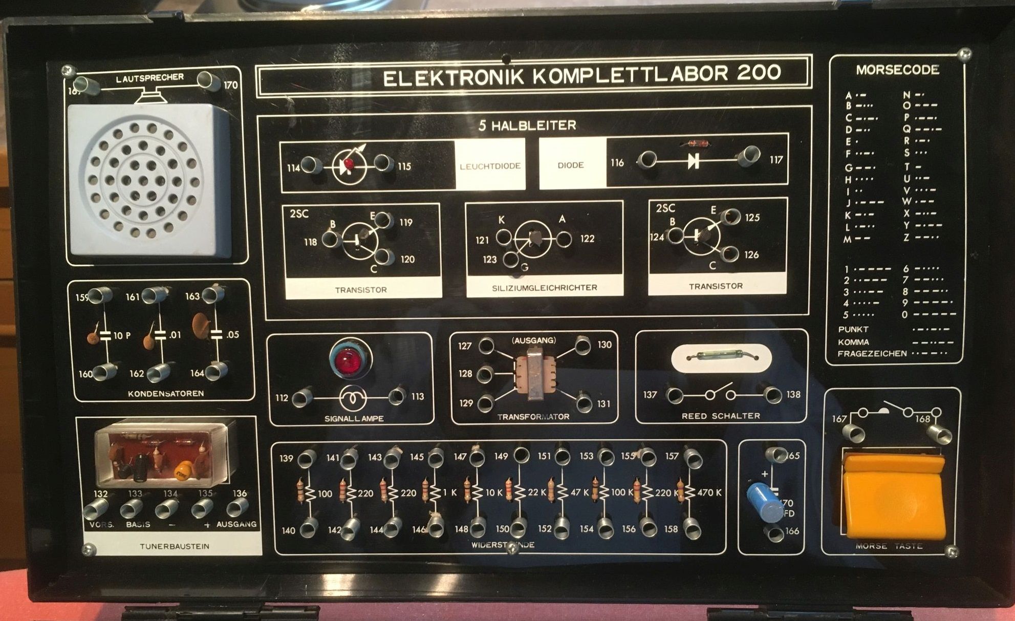 Ein Gerät dieser Art ist mir ohne Handbuch dieser Tage zugeflogen. Es unterscheidet sich wesentlich von denen in dieser Rubrik vorgestellten Baukästen. Die Einzelkomponenten sind auf einer Montageplatte über Kontaktfedern fest installiert und müssen über zum Teil längere Kabel handverdrahtet werden. Das Handbuch ist im Internet frei verfügbar. Es erklärt allerdings sehr wenig und ist daher pädagogisch von eher geringem Wert. Man kann anhand von Verdrahtungstabellen monoton die einzelnen Verbindungen zwischen den Bauteilen herstellen ohne sein Gehirn anzustrengen. Die Vielzahl der Bauelemente liesse allerdings sehr viele eigene Experimente zu, die über die 200 vorgefertigten Bauvorschläge hinausgehen. Der Baukasten enthält folgende Bauelemente: