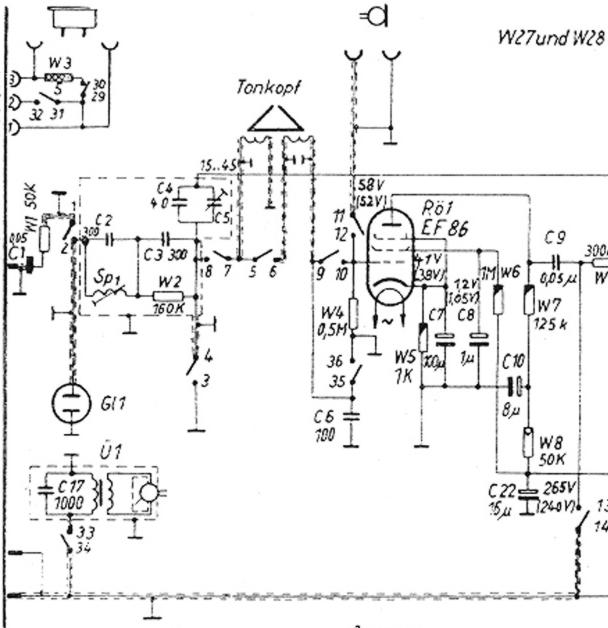 Dein Problem habe ich erst jetzt mitbekommen. Der richtige Anschluß dieser Geräte ist ohnehin nicht ganz einfach, zumal wenn man Mikrofonaufnahmen machen will. Wie kam es aber zu der Verwechslung der Anschlüsse?. Beim Topas 23b (MTG22b) werden nur Bananenstecker benutzt. Ab MTG24 ist ein 3poliger Stecker vorhanden. Dieser TA-Stecker hat einen flachen Mittelstift. Bei anderen Tonbandgeräten hat der Stecker für den Lautsprecherausgang des Empfängers einen runden Mittelstift. Netzanschluß ist ein ganz normaler 2poliger Stecker. Schuko gab es ja noch nicht. Es ist erstaunlich, daß nicht mehr passiert ist. Die Spannung kann nur über die Schalter 25/26 und 23/24 ins Gerät gekommen sein. Und Masse? Der Aufwärtstrafo für den Tonarm hat scheinbar umgekehrt gearbeitet Bei alten Tonbandgeräten ist auch bei richtigem Netzanschluß manchmal Vorsicht geboten. Es kann eine Berührungsspannung beim Anschluß an ein Radio auftreten. Ich denke, daß Du den Fehler mit Ingos Hilfe beheben kannst. Was die Motoraufhängung betrifft, hatten die Geräte ab MTG24 eine 4. Transportsicherungsschraube in der Nähe des Motorschwenkschalters.