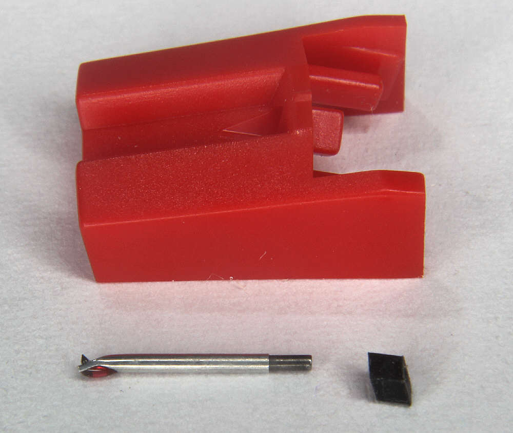 Der rote Nadelträger ist leider auch zu groß. Erstens würde er mit seinen Seitenführungen auf der Wippe des Tefifon aufliegen, wodurch das System so weit nach oben ragen würde, dass die Nadel nicht mehr auf die Einlaufrille des Bandes justiert werden könnte. Ausserdem ist er zu lang und würde mit der brauen Plastikabdeckung des Tefifon kollidieren. Daher muss er reduziert werden. Um nichts zu beschädigen, wird die Nadel und das Gummilager aus dem Nadelträger entfernt. Die Nadel wird einfach vorsichtig aus dem Gummilager nach vorne abgezogen und das Gummilager von hinten nach vorn mit einem Zahnstocher o.ä. herausgedrückt.