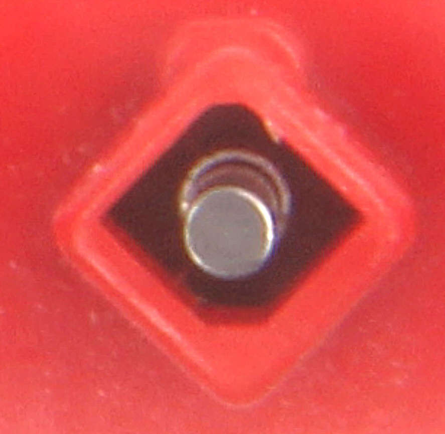 Das Foto zeigt den originalen Nadelträger von hinten ohne Manipulation. In entspanntem Zustand, also wenn die Nadel frei hängt ohne Kontakt zur Schallplatte zu haben, liegt das Aluröhrchen in dem der Magnet steckt, am Kunststoff des Nadelträgers an.