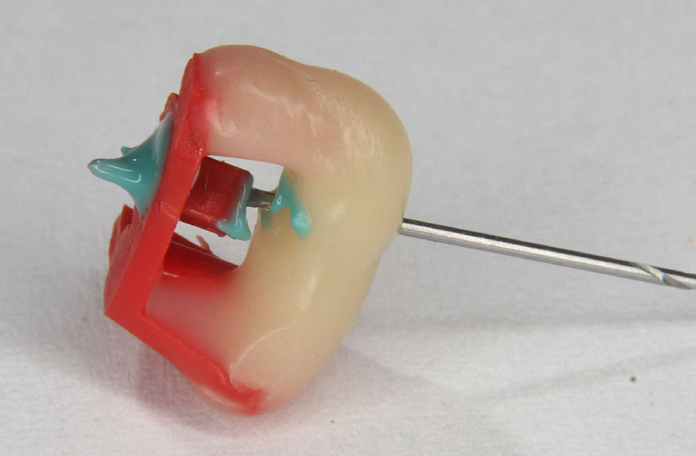 Nach dem Aushärten wird der Bohrer herausgezogen und der Überstand mit einem Skalpell sauber und bündig abgeschnitten.