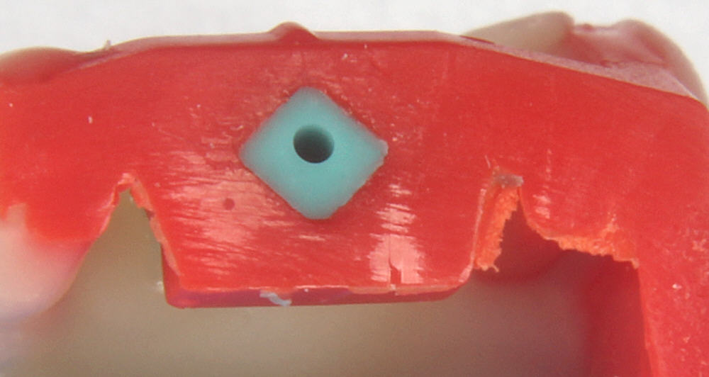 Nach der Polymerisation lässt sich der Bohrerschaft völlig spielfrei aus dem Komposit herausziehen und wieder einführen. Der Schaft dient als Platzhalter für das Aluröhrchen und erzeugt das durchgehende Loch im richtigen Winkel für das neue Gummilager.