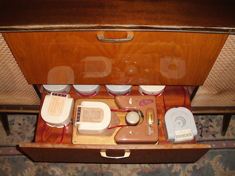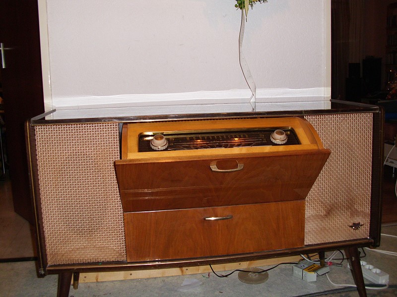 Hallo Durch zufall hab ich irgentwo mal einen Bericht über Tefifone gelesen. Seitdem hab ich immer nach einem Tefi Ausschau gehalten aber leider nie etwas Bezahlbares gefunden. Dann fand ich auf dem Flohmarkt ein Tefi KT1. der Preis wahr angenem und ich nahm es mit. Der Gesammtzustand ist sehr gut, nur das System ist leider hin. Da ich jetzt richtig Infiziert war hab ich dann immer wieder mal in der Bucht Ausschau gehalten. Irgentwann stand mal eine Tefitruhe mit funktionierendem Radio und defektem Tefi drinn. Ich hab dann mal 10€ geboten und bin mittags zur arbeit gefahren. Abends hab ich dann mal nachgesehen für wieviel die Truhe weggegangen ist und konnte es kaum glauben als beim Einloggen das übliche Herzlichen Glückwunsch kam. Ich hab die truhe dann ein paar Tage später mit meinem Neffen abgeholt. Nachdem sie im Flur stand hab ich sie eingeschaltet und das Radio lief. Ohne Antenne nur WDR2 aber immerhin. Beim Tefi hing der Motor fest. sonst sah es noch gut aus. Ich hab dann vorsichtig etwas WD40 an die Lager gesprüht und es eingeschaltet. Nach zwei oder dreimal anschubsen drehte der Motor. Erst langsam und nach kurzer Zeit lief er vollkommen normal. Mein 16jähriger Neffe konnte es kaum fassen und als von den " Schallbändern " noch Musik kam verlor er fast den Glauben an die moderne Technik Seitdem läut die Truhe fast jeden Tag und der Klang ist mehr als Überzeugend. Leider ist über die Tefis kaum etwas zu finden. Wenn jemand zufällig von meiner Truhe etwas an Unterlagen da hat bitte melden. Ich bin für alles dankbar