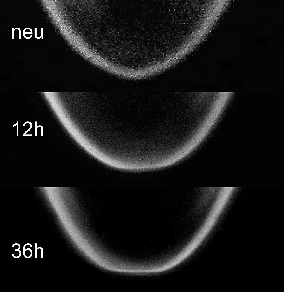Wie man deutlich sehen kann, ist bereits bei 12h ein leichter, bei 36h schon ein deutlicher Verschleiß der Nadel erkennbar. Was dabei interessant ist: Nicht die Flanken, sondern die Verrundung der Nadel ist abgeschliffen. An den Flanken ist noch nichts erkennbar.