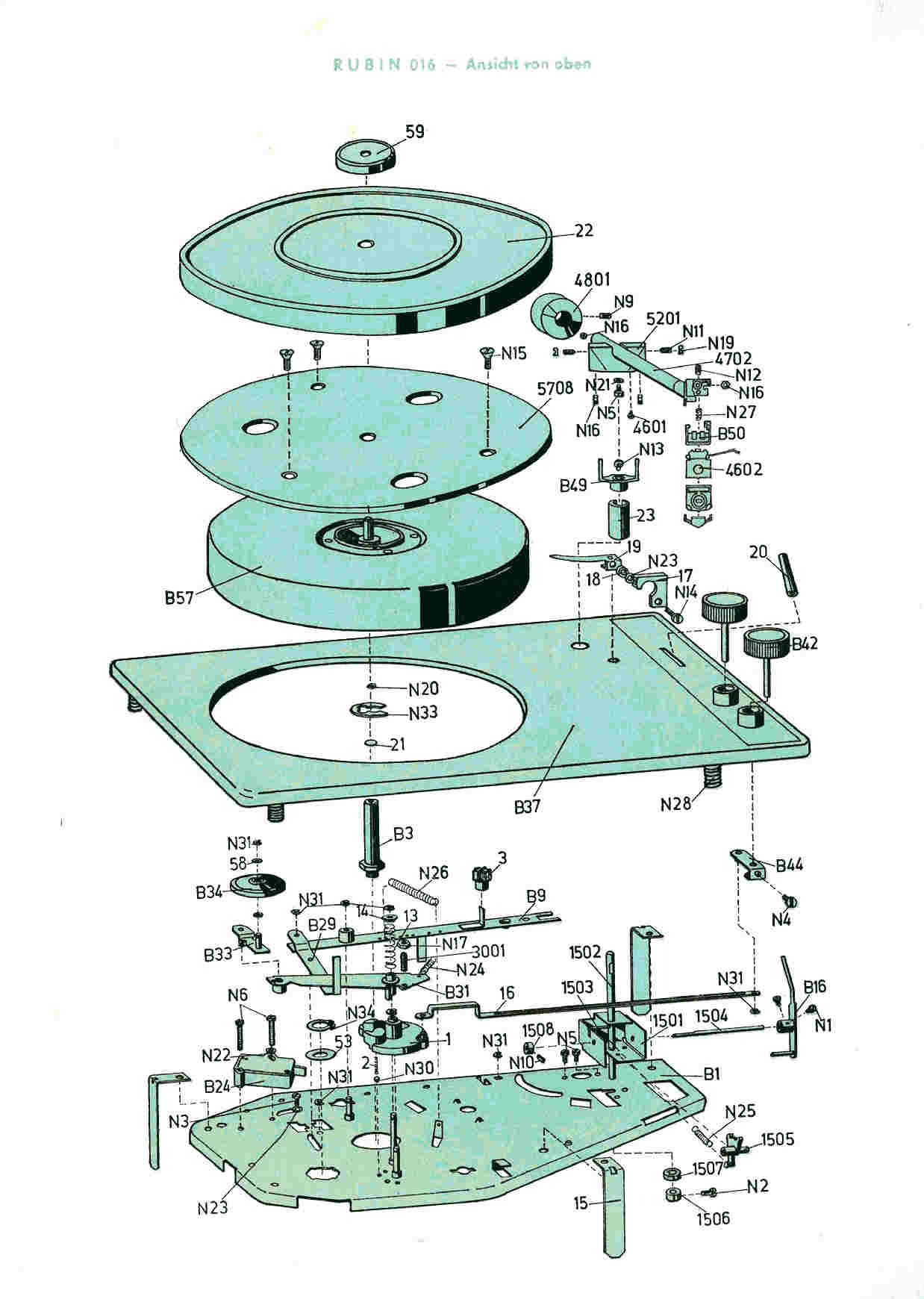 Zunächst ein herzliches Willkommen hier im Forum. Ich habe mich bisher mit einer Antwort zurückgehalten, weil meine Kenntnisse hinsichtlich Plattenspieler begrenzt sind. Der Teller ist nach meiner Erinnerung mit einem Sicherungsring fixiert. Anbei eine Explosivdarstellung zur näheren Erklärung. Nach dem Abnehmen des Gummitellers kann der Teller abgeschraubt werden und man gelangt an den Sicherungsring. Das ist aber bei mir ewig her, daß ich mit diesem Laufwerk zu tun hatte.