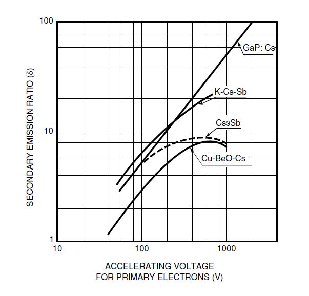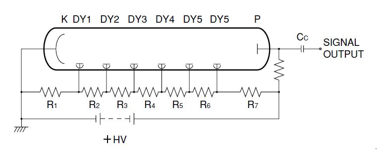 Das Bild Vervielfachung zeigt einen Seitenfenster-PMT (übrigens mein Logo) von oben. Wenn man mal nur die Elemente 1 und 2 betrachtet, dann sieht man hier den Vervielfältigungs-Effekt. Man muss sich vorstellen, das Element 1 ist k2 bei der EE1 und Element 2 ist die Anode. Das Bild Halbwertsbreite zeigt das Signal der 'Elektronenwolke' an der Anode. Die Anode ist mit einem 50Ohm Widerstand gegen Masse geschaltet. Die Kathode arbeitet hier mit negativer Hochspannung. Man kann aber auch positive Hochspannung verwenden und über einen Kondensator auskoppeln, so wie es in der Radiotechnik ja üblich ist. Dies sieht man im Bild PMT_1. Die Verstärkung ist abhängig von der Hochspannung (bei der EE1 das Potential zwischen der Kathode und k2) und von dem Material mit dem die Dynode beschichtet ist. Im Bild QE kann es deutlich sehen. Das Bild PMT zeigt noch einmal den Vervielfältigungsprozess.