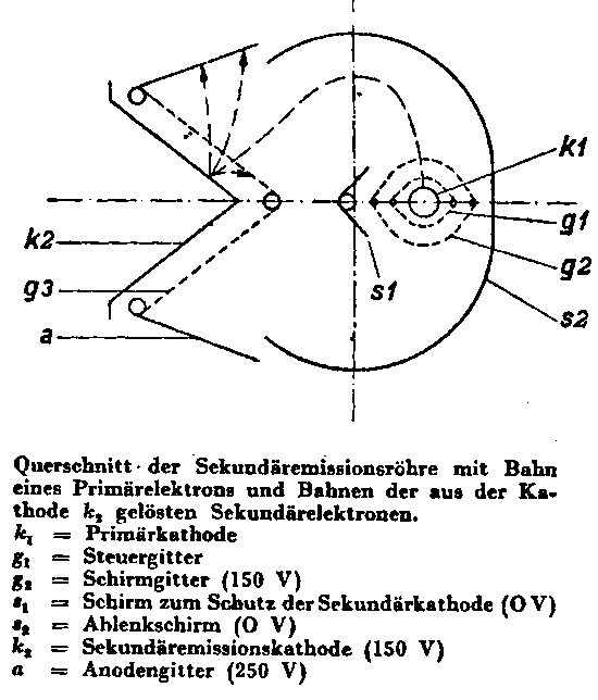 Das Grundprinzip ist bei der Sekundäremissionsröhre (k2) und der Dynode eines Vervielfachers gleich, so wie Du es beschrieben hast. Der Unterscheid ist das ein Tetrodensystem vor der k2 ist. Dieses steuert wie eine normale Röhre über das g1 das System bis zur k2, die ja selber auch eine Steuerfunktion besitzt. Das die EE1 und die Fernsehröhre EE50 keine weite Anwendung fanden ist wohl der aufwendigen Beschaltung von Katode und g1 zu verdanken. Die Katode wird 23 V ! positiv gegenüber Masse vorgespannt und das Gitter über einen Spannungsteiler 20 V. So eine hoch liegende Katode ist nicht einfach zu Handhaben bei einer Röhre mit so hoher Verstärkung, zumindest früher nicht. Der Aufwand für Schirmung etc. wog wohl die Ersparnis einer Röhre als Vorstufe auf.
