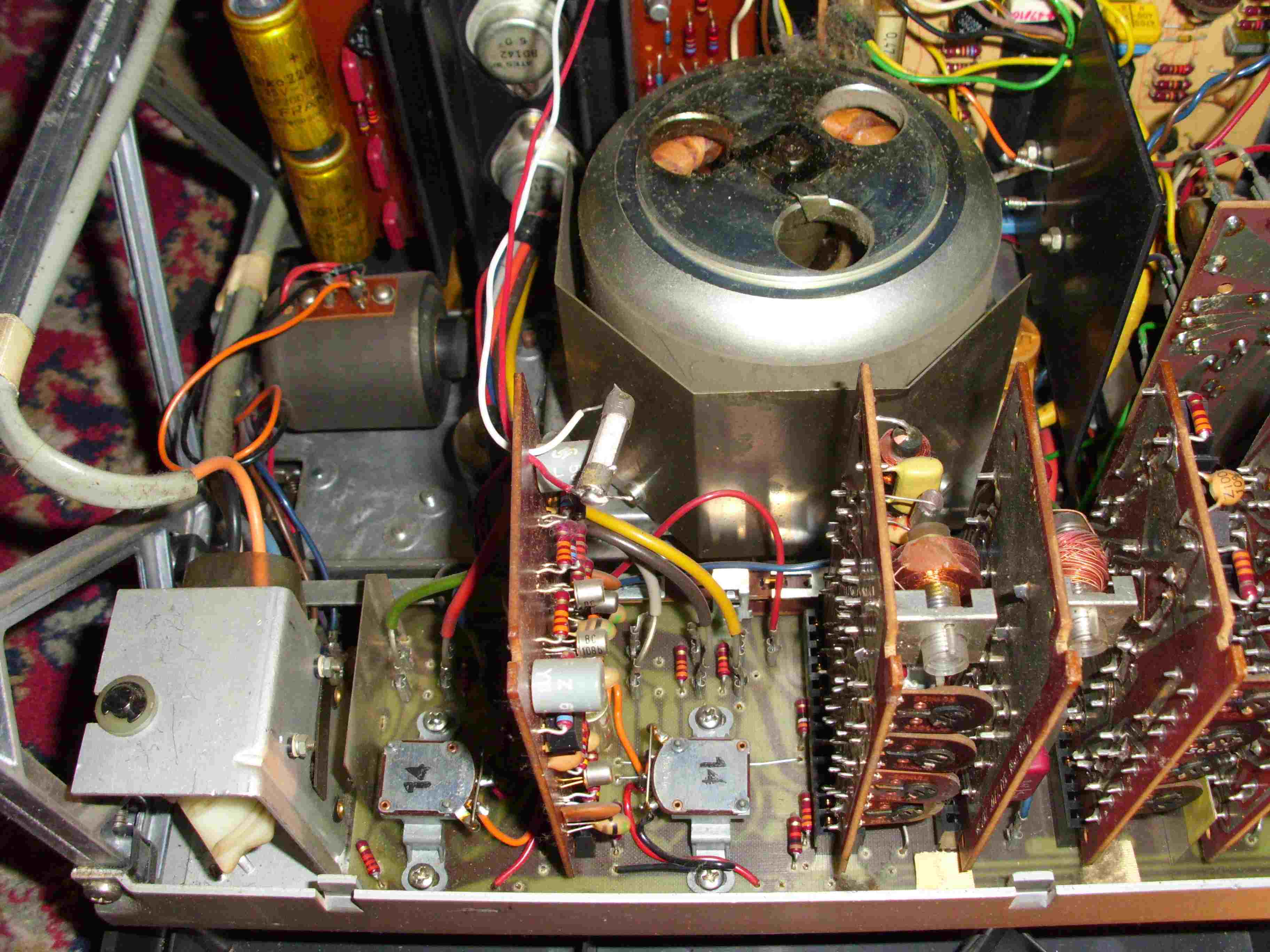 Gestern hab ich mir (leider) mal wieder was zun spielen gekauft. Das Angebot in den Kleinanzeigen war einfach zu verlockend. Der Verkäufer sagte mir am telefon das er die A77 von seinem Bruder geerbt hätte und das sie schon seit jahren im Keller steht und er keine Verwendung dafür hat da er selbst eine GX635 von Akai betreibt. Er wies mich auch darauf hin das sie zwar aufnehme aber beim abspielen ein Kanal fehlt. Als ich bei ihm war sagte er das sie aus einem Tonstudio stamme wo der Bruder sie her hatte. Zuhause angekommen erst mal eingesteckt, Band drauf und getestet. OK, rechter Kanal nicht da. Ich hab sie dann aus dem Gehäuse gehoben und hatte wie man auf den Bildern sieht den Verdacht das da jemand drann war der vorsichtig ausgedrückt in seinem job nicht den besten Tag hatte. Ich hab erst mal die beiden Ausgangsverstärker die man auf den Bildern sieht gegen ein ersatzpaar getauscht. Und was soll ich sagen, sie lief. Die original Platienen hab ich neu bestücht und den dollen Sicherungshalter gleich mit ersetzt. Der graue elko wurde ersetzt und hatte nicht wie der rote(Serie) 63Volt sondern nur 35Volt, deswegen ist der auch etwas außer Form geraten. Die beiden Platienen mit der flugsicherung sind die Leistungsverstärker da die A77 ein Koffergerät mit eingebauten Lautsprechern ist. Ich hab heut dei Bänder aufgenommen und sie läuft bisher ohne Probleme. Die restlichen Steckplatienen muß ich noch machen und dann ist sie wieder schön. der Koffer rechts neben der Revox ist eine A36 aus der ersten Serie