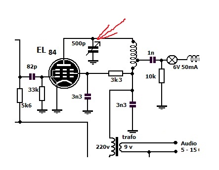 Der Kondensator muss zwischen dem Drehko und dem Anodenanschluss der EL84 geschaltet werden. Dort trennt er die dort vorhandene hohe Gleichspannung vom Drehko. Die Größe kann z. B. 10nF betragen, da wäre die Gesamtkapazität der Reihenschaltung rund 476pF. Der "Trennkondensator" muss dann ausreichend spannungsfest sein. Mit einem C-Trimmer parallel zum Drehko lässt sich bei Wunsch und Bedarf die Endkapazität wieder auf 500pF einstellen.