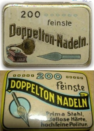 hier bezieht sich das "Doppelton" auf zwei verschiedene Lautstärken (Wie "laut" eine Nadel war, hing von ihrer "Dicke" ab). Steht die "Kelle" der Nadel waagrecht zur Platte, wird (via dem Motor) mehr Energie aus der Rille auf die Schalldose übertragen, da die Nadel in dieser Position recht steif ist. Die Nadel spielt nun als "Laute" oder "sehr Laute" Nadel.