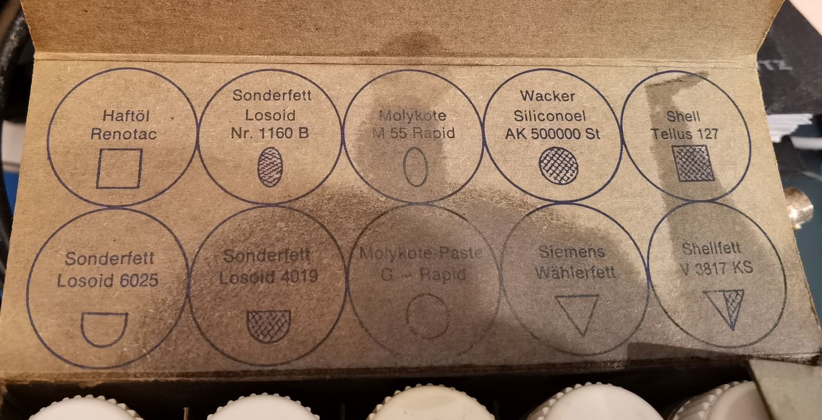 In alten längst vergangenern Zeiten gaben die Hersteller für ihre Unterhaltungselektronikprodukte wie Tonbandgeräte, Platten- und Cassettenspieler Schmiermittelsets heraus. Als Beispiel zeige ich mal so eines von der alten Marke Telefunken. 10 (!!!) Fläschchen mit unterschiedlichen Fetten und Ölen und Pasten mit Molybdänsulfid (Molykote) als trockenes technisches Schmiermittel. Eine Art trockenes Schmiermittel bestimmt auch in deinem Fall! Aber wie gesagt hilft hier das Lesen der Servicevorgaben in den Herstellerunterlagen die hier unbedingt zu Rate gezogen werden sollten.