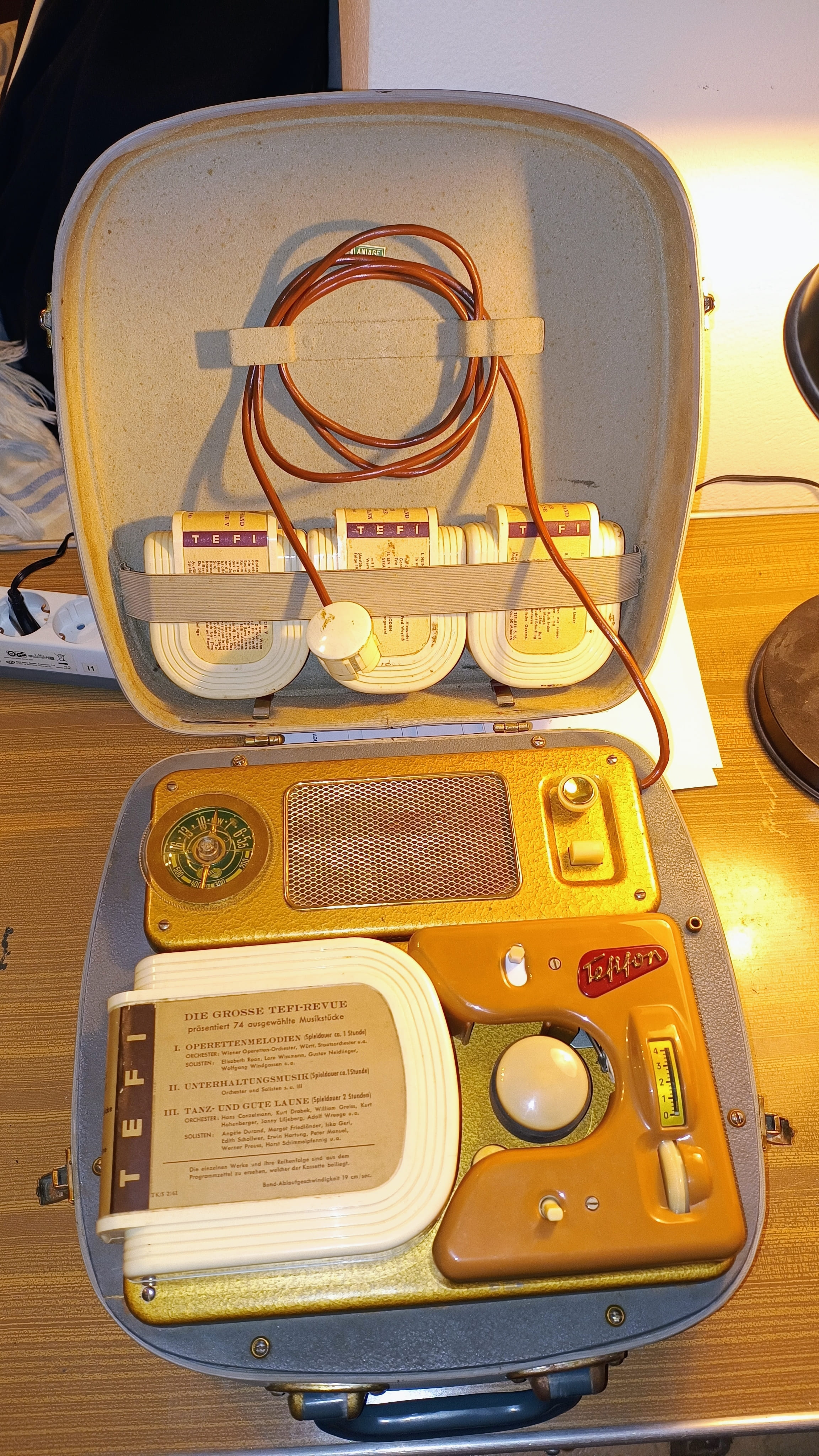 Heute möchte ich euch mein Tefifon vorstellen. Ich sitze schon ei paar tage am Gerät, als ich es bekam ging garnichts. Nachdem ich alles grob gereinigt hatte und die Ferrit Antenne ( Die leider gebrochen war) Klebte und mit einem Schrumpfschlauch zusätzlich stabilisierte, konnte ich gegen Abend Laut und deutlich Sender aus dem Ausland empfangen. Das Tefifon drehte auch noch, nur leider war das KC15 System völlig aufgelöst. Also besorgte ich mir einen Ersatz mit SK451 und hatte glück das der TA noch was taugte. Da das Ersatz tefifon allgemein besser aussah, sämtliche gummis völlig intakt waren, tauschte ich das Tefifon im ganzen. Nach dem Wechsel ist nun der Stand, Es läuft alles. Das Sk451 macht super Arbeit, Der Ton wird ordentlich verstärkt, war sogar überrascht was da so aus dem Lautsprecher raus kam.