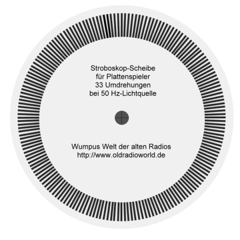 in Verbindung mit einer Stroboskopscheibe und einer normalen Glühbirne * kann man ja gut die Geschwindigkeit von Plattenspielern kontrollieren. Ich habe im Wumpus-Kompendium dazu was geschrieben und eine ausdruckbare Stroboskopscheibe für 33 1/3 - Umdrehungen selbst hergestellt und beigelegt: