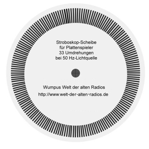 Hallo zusammen, in Verbindung mit einer Stroboskopscheibe und einer normalen Glühbirne * kann man ja gut die Geschwindigkeit von Plattenspielern kontrollieren. Ich habe im Wumpus-Kompendium dazu was geschrieben und eine ausdruckbare Stroboskopscheibe für 33 1/3 - Umdrehungen selbst hergestellt und beigelegt: http://www.oldradioworld.de/hints-reparaturen.htm#125