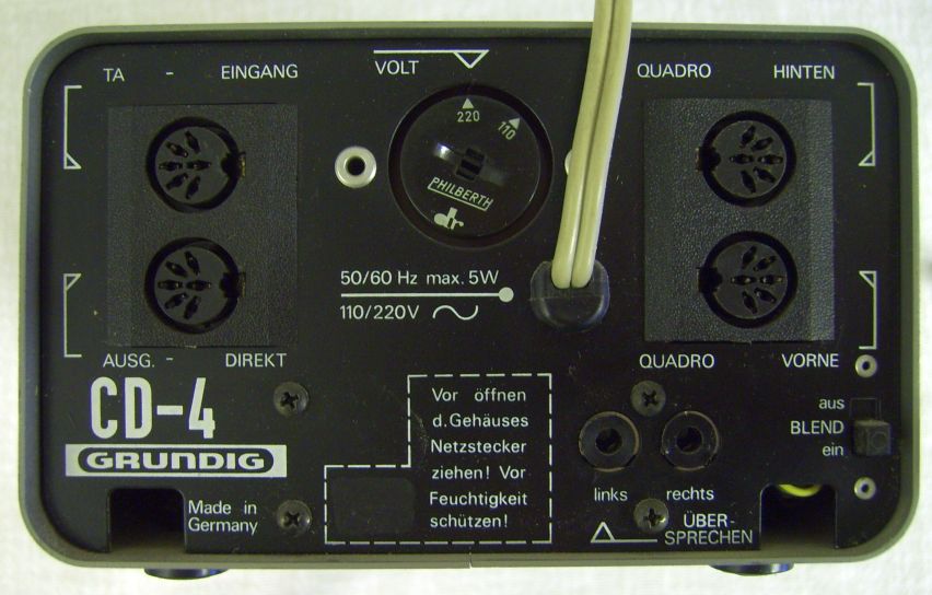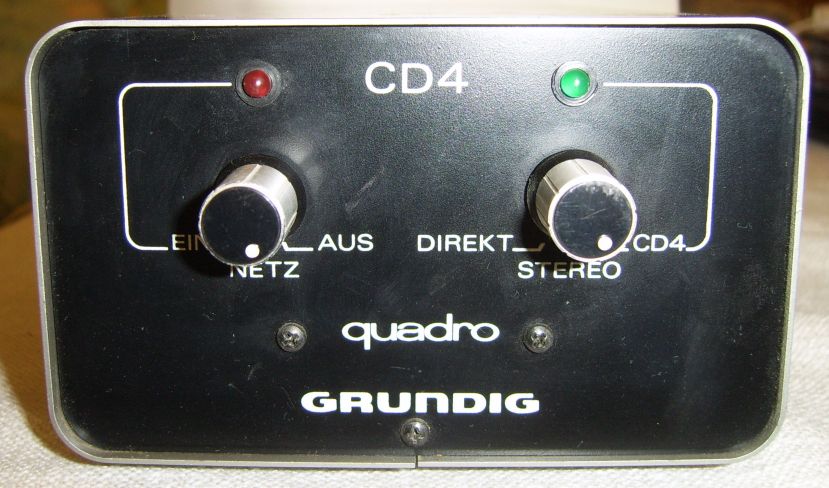 ich hoffe ich bin hier nicht im falschen Thread. Zu meinem Problem, ich habe einen CD-4 Demodulator (siehe Bilder) von Grundig. Mit diesem Gerät konnte man vom speziellen LP's statt einem Stereo Signal ein Quadro Signal bekommen. Ähnlich wie beim UKW Stereo Signal erzeugten solche Schallplatten zusätzlich einen Pilotton (jedoch mit höherer Frequenz). Dadurch konnte man 4 'echte' Kanäle bekommen. Gibt es noch Schallplatten die CD-4 wiedergeben? Zu dieser Zeit war auch Kunstkopfstereofonie aktuell. Vor (sehr) langer Zeit habe ich mal eine LP im Rundfunkmuseum in Berlin (am alten Funkturm) gekauft, die KuKo wiedergab. Leider kann sich dort niemand mehr an diese LP erinnern. Kann man diese LP noch bekommen? Auf ihr war die erste Werbung (von einem sehr bekannten amerikanischen dunkelbraunen Getränk), die im Radio in Stereo (ein Kanal auf MW und ein Kanal auf UKW) wiedergegeben wurde. Ausserdem war noch ein Auszug von einem Science Fiction Hörspiels drauf. Ich kann mich noch gut erinnern, ich sass dort mit einem Stereo-Kopfhörer mit dem Rücken an der Wand und plötzlich hörte ich eine Person hinter mir. Unwillkürlich sprang ich auf und schaute hinter mir, obwohl dort niemand sein konnte. Leider ist mir diese LP zerbrochen. Sollte jemand diese LP besitzen wäre ich daran sehr interessiert.
