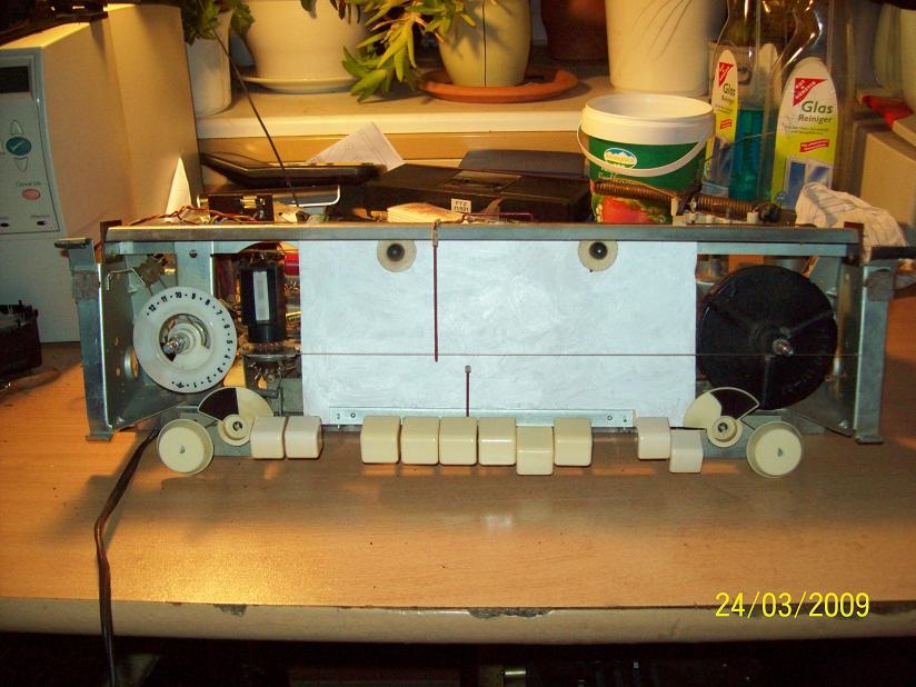 So wie es aussieht, sind die Seile und Federn bei meinem Radio abhanden gekommen. Davon ist nichts mehr zu sehen. Ich hatte auch nochmal im Gehäuse geschaut, ob dort etwas "herumliegt", aber Fehlanzeige.