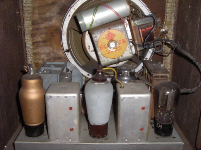 Der äußere Zustand des Radios ist gut; ich denke jedoch, dass zwei der vier Drehregler an der Frontseite nicht original sind. Das Innere sieht zunächst sehr aufgeräumt aus. Drei der vier Röhren leuchten; wenn ich das Radio einschalte, kommt jedoch nur ein Brummen. Denke mal, dass einige alte Bauteile ausgetauscht werden müssen.