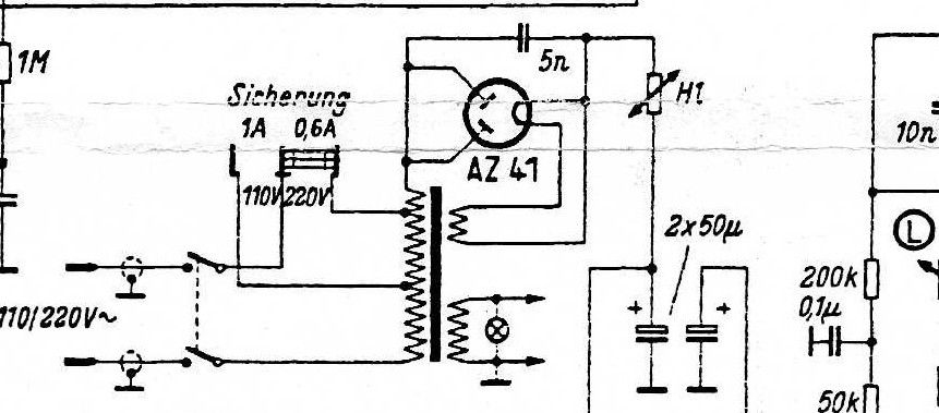 Vielleicht solltest Du statt der Diode als Gleichrichter schauen ob Du einen geeigneten Selengleichrichter findest und diesen dann einsetzten. Er hat ähnlich wie die AZ41 einen höheren Innenwiderstand und die Spannungen am Lade- bzw. Siebelko ist dann nicht mehr zu hoch. Das Thema mit der Bewältigung der höheren Netzspannung (230 statt 220 Volt), für ältere Geräte, die auf 220 Volt bezogen sind, hatte Jürgen schon mal erwähnt. Da könnte man bei einem alten Heiztrafo die Primärwicklung entfernen und nur noch die Sekundärwicklung (Heizwicklung) mit dem Primärkreis des Netztrafo`s in Reihe schalten. So wirkt das wie eine Erhöhung der Primärwindungszahl und die Spannungen auf der Sekundärseite des Netztrafo`s kämen in den Normalbereich. Es ließe sich probieren. Beste Grüße von Dietmar