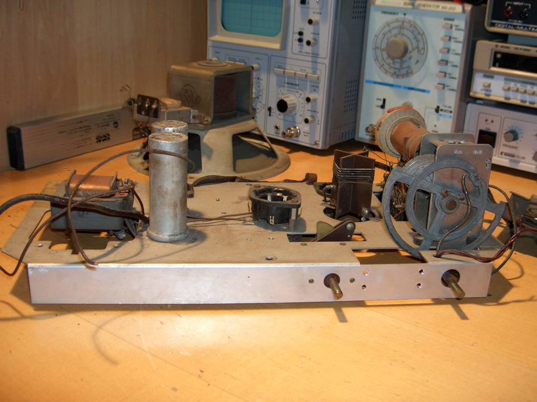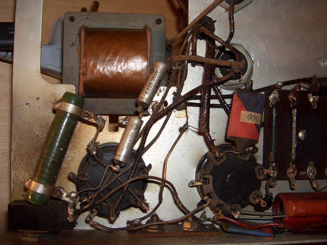 Der Trafo könnte eine Siebdrossel sein. Das beißt sich zwar mit der Angebe im RM, daß ein elektrodynamischer Lautsprecher eingebaut ist, aber auch im RM darf man nicht alle Angaben kritiklos glauben. Leider ist auf den Bildern von Friedrich die Ausführung des Lautsprechers nicht eindeutig zu erkennen.