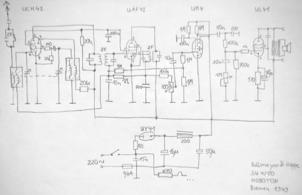Das heisst, man hat probiert, was geht! Und die Bremer Firma hats auch gleich übernommen, oder umgekehrt? Bei der Eingangs- und Mischröhre UCH42 gibt es jedoch eine Abweichung zur Schaltung des Hoboton, die Regelspannung wird direkt über 1 MOhm an g1 der UCH42 geleitet, der Eingangskreis ist dort mit 100 pF angekoppelt.