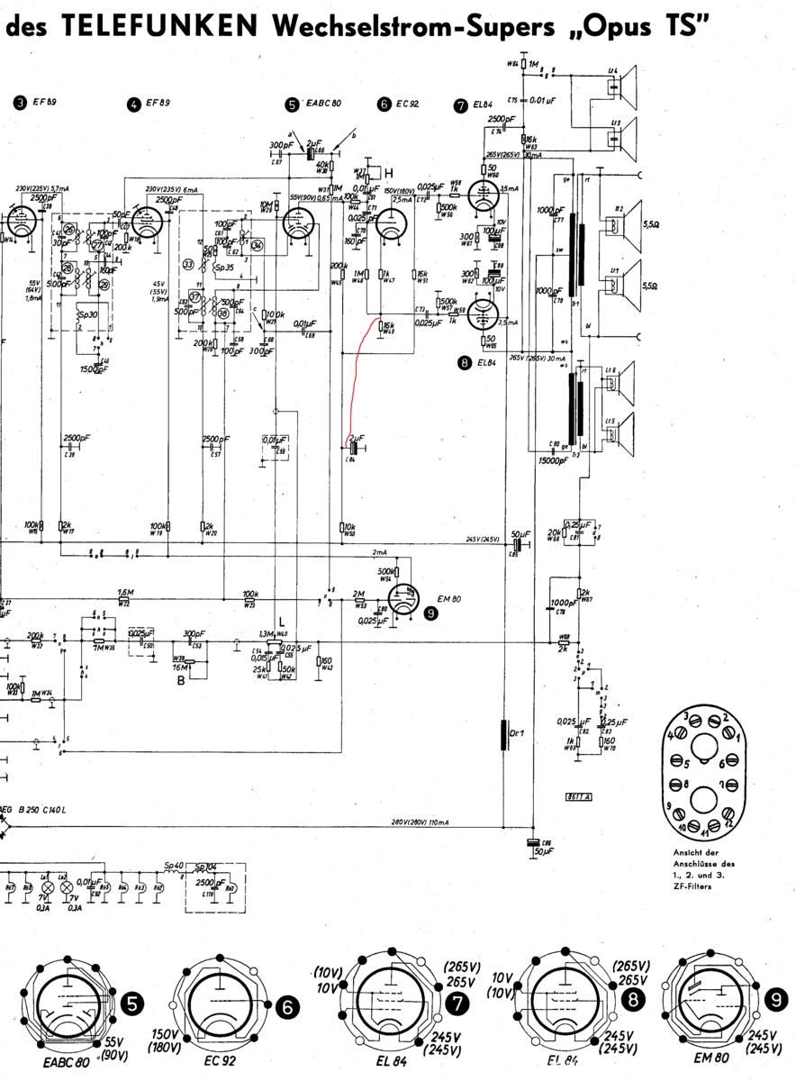 Hab das gleiche Chassis als AEG, nur bei mir fehlen die Front LS die suche ich noch. Eine Tendenz fiel mir auf die EC 92 = 172V Soll 180V bei niederohmigeren Voltmeter und den rel. kleinen Außenwiderständen W50 + W51 = 26 kOhm bei der richtigen Betriebsspannung von 280V. EABC 80 87V Soll 90V bei 200 kOhm Außenwiderstand bei 280V. Die - ug1 der EL 84 soll 10V betragen, also leichter AB Betrieb der Gegentakt - Endstufe. Es fehlen also ein paar Volt, tendenziell musste ein DMM außer bei - ug 1 der El 84 mehr anzeigen. Norbert wird da auf der richtigen Spur sein, es sind eine Menge Bauteile in der Peripherie der beiden Röhren verbaut. Wie gesagt Voraussetzung ist die richtige Betriebsspannung von 280V. Die - g1 der EC 92 müsste 42,5V gegen MASSE sein zwischen Stift 6 + 7 2,5V. Diese Röhre arbeitet als Phasensplitter.