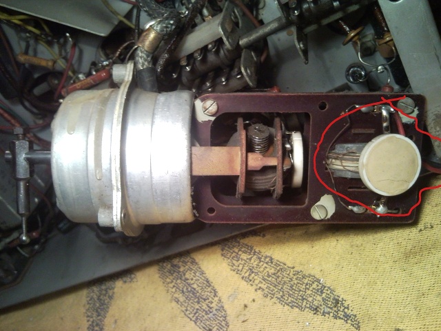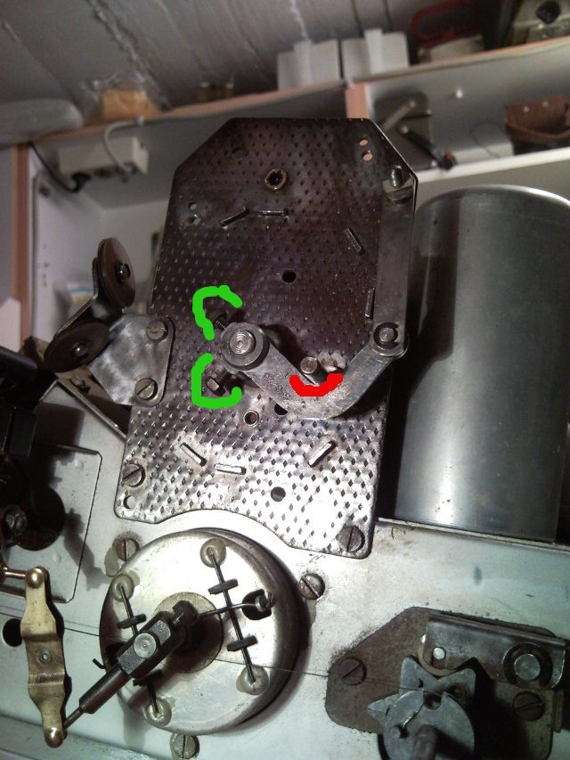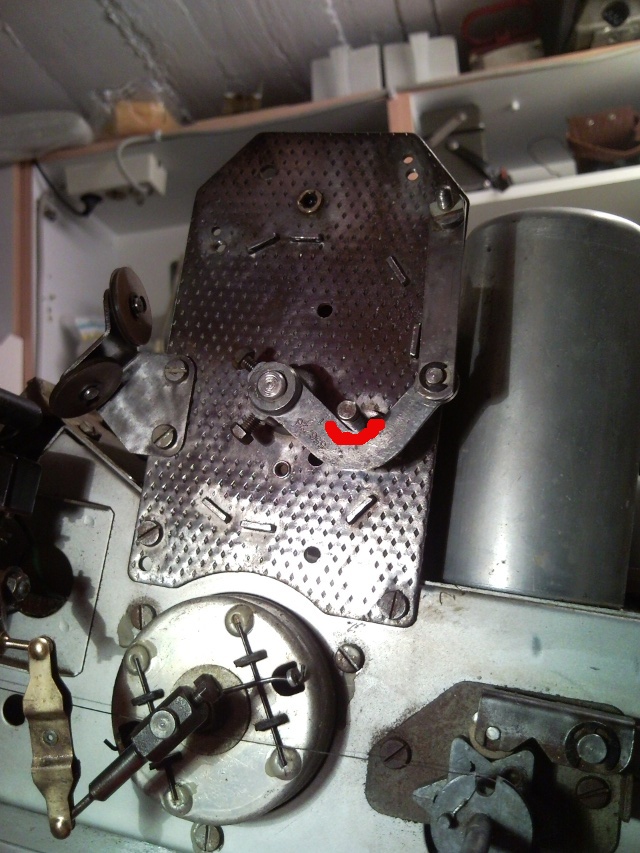 Auf der runden Achse sitzt normalerweise ein Seillaufrad, was über den Hebel den Drehko antreibt. Rot markiert ist die Stelle, wo sich Hebel und Achse bei voll ausgedrehten Drehkos berühren. Diese Stelle hatte ich so vor dem Zerlegen vorgefunden, so dass ich sie beim zusammen bauen wieder einstellen konnte, wie es vorher war.