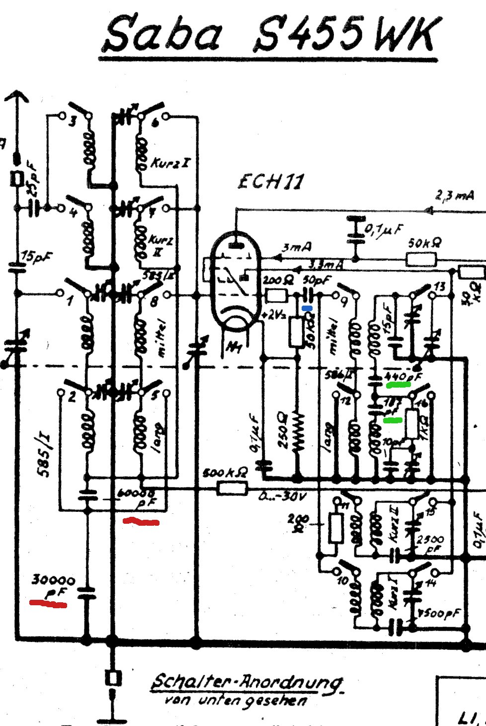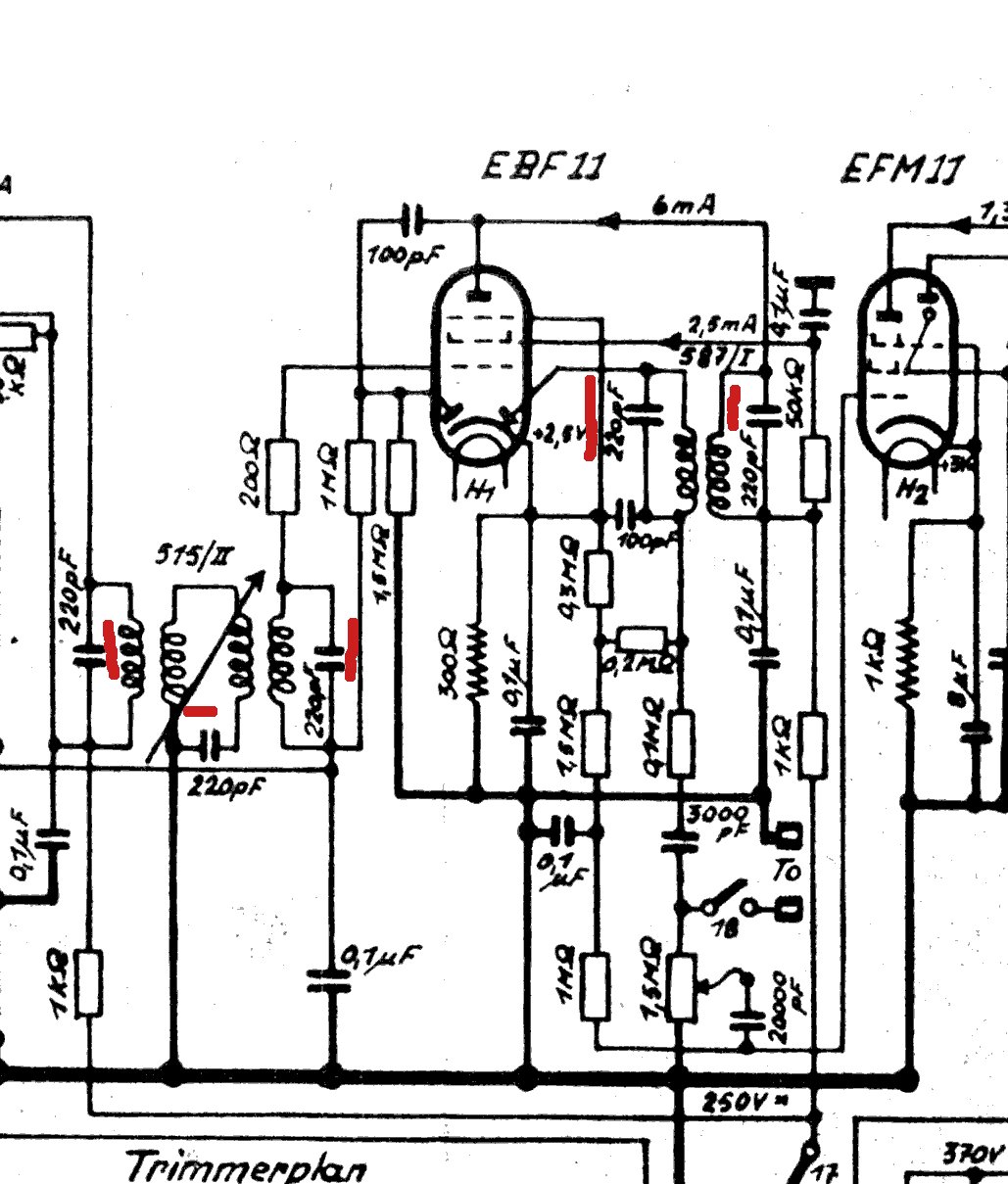 ich bin etwas am Verzweifeln mit dem Saba. Nach Tausch diverser Kondensatoren läuft er ganz stabil. Leider musste ich auch die 5 Eurotalerkondesatoren in den ZF-Bandfiltern tauschen, weil die allesamt defekt waren (Kapazität war deutlich geringer als 220 pF). Zur Orientierung habe ich mal hier einen Planausschnitt angehängt - die Übeltäter sind rot markiert mit zusätzlich einem Beispiel - da sieht man die Risse in der Vergussmasse des Kondensators. Daraus folgte natürlich ein nötiger Neuabgleich der ZF, was mit der Anleitung kein größeres Problem war.