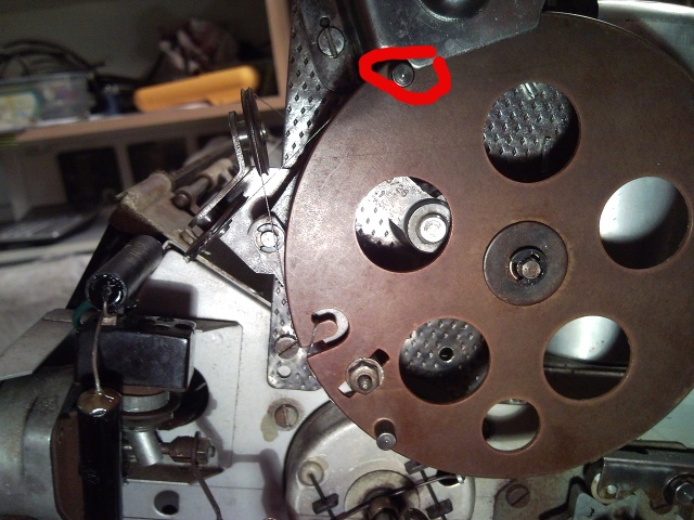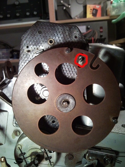 Nun das Seillaufrad wieder montiert: Die rot markierte Stelle zeigt die Druckstellen, wo die Mutter saß, die den Hebel mit dem Seilrad verbunden hat. Somit habe ich auch diese Stelle wieder installiert wie vorgefunden.