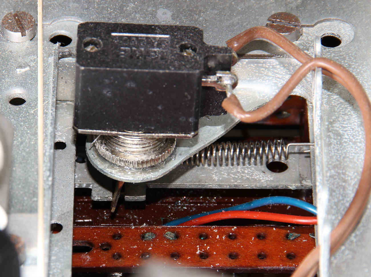 achim01:Hallo zusammen, ich darf das korrigieren, es handelt sich nicht um einen Taster, sondern um einen Schalter der von einer Gabel am Tastenaggregat betätigt wird, deshalb braucht er auch ein bisschen Spiel in der Gabel. Die Reparatur ist einfach. Schalter dieser Bauart sind noch erhältlich - nicht genau die gleichen, aber sehr ähnlich. Satt des abgeflachten Hebels des Originals besitzen sie einen runden Knebel den man aber leicht mit der Feile entsprechend abflachen kann. Unter anderem ist der Schalter bei Conrad erhältlich.