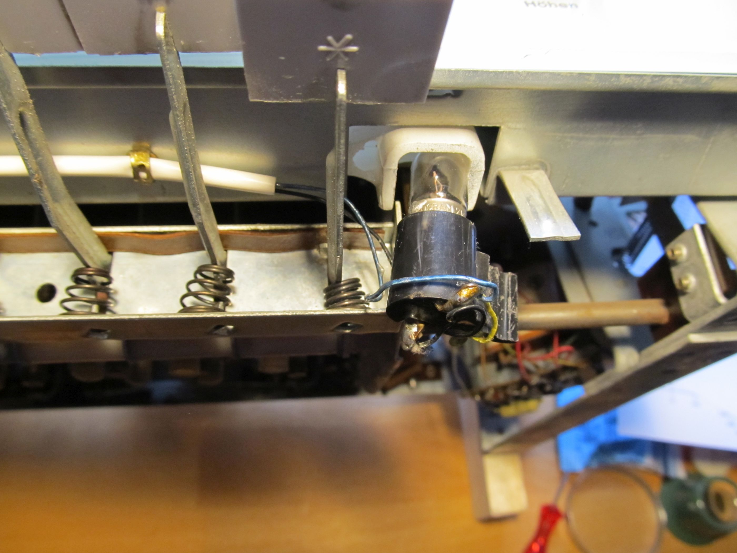 Was aber noch viel interessanter ist ist die Tatsache, das die beiden Skalenbirnenn laut Plan, gleich hinter dem Trafo mit 6 Volt versorgt werden sollen. Werden sie aber definitiv nicht. Die sind elektrisch gesehen an dem Punkt b abgegriffen, wo es in den UKW Teil geht. Ja und leider sind bei dem Radio die Halter für die Skalenlampen kaputt. Ich vermute da hat es bei der einen einen Kurzen gegeben. Ich werd die erst einmal mit Kabelbindern fixieren.