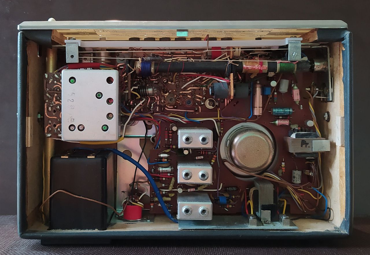jetzt läuft das Gerät wieder. Da hat mal wieder jemand gepfuscht. Nachdem ich das Chassis ausgebaut hatte sah ich einen übergrossen Lötklecks der auch mit der benachbarten Lötstelle verbunden war. Deswegen konnte man den Ruhestrom nicht richtig einstellen. Obwohl das Poti schon auf Anschlag stand, betrug der Ruhestrom immer noch 46mA. Eigentlich sollte er bei diesem Gerät, laut Schaltplan, bei 9V Versorgungsspannung auf 15mA eingestellt werden. Beim Ausbau habe ich dann auch die Typenbezeichnung gefunden. Der Zettel klebt auf einem Filter neben dem Drehko. Im eingebauten Zustand sieht man da allerdings nicht hin (toll). Ach ja und dann gibt es noch die spezielle Ferritantenne mit einem Loch in der Mitte. Wozu soll denn das gut sein? Will man hier Material sparen, oder gibt es einen technischen Grund dafür.