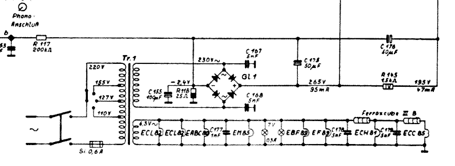 Habe im "Raupenhaus"(Schaltungs-Quelle) ein Schaltbild gefunden, was vom Namen her Deinem Radio entsprechen müsste. Das Fehlerbild an Deinem Radio deutet auf eine andere Ursache, als einen "Kurzschluss" im Primärwickel des Netztrafos. Genau hinter der Feinsicherung, am Trafoeingang, befinden sich laut Schaltplan zwei 5 Nanofarad - Kondensatoren, die in Reihe geschaltet sind und dessen Mittelpunkt zur Masse geht. Sie dienen der Vermeidung der Brummmodulation. Diese Kondensatoren haben sicher einen Kurzschluss und wären die Ursache für das Abschmelzen der Feinsicherung sein, bzw. für den relativ niedrigen Eingangswiderstand des Trafos. Wenn Du sie findest, kannst Du sie erst mal glatt entfernen. Das Radio funktioniert auch ohne diese "Zusatzbeschaltung". Später könntest Du Dir zwei neue spannungsfeste Kondensatoren besorgen und bei Bedarf die alten und kaputten ersetzen. Muss aber nicht unbedingt sein. Viel Erfolg bei der Fehlerbeseitigung.