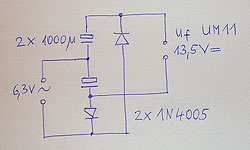 Über einen Spannungsverdoppler (symmetrisch) lassen sich aus der Heizspannungsversorgung 6,3 V AC theoretisch die doppelte Scheitelspannung abzüglich 2 mal Diodendurchgangsspannung gewinnen, also rund 16,5 V DC, jedoch ohne Last. Die EM 11 braucht 15 V Heizspannung und 100 mA Heizstrom. Das sollte also passen mit den richtig gewählten Kondensatoren für den Heizdraht von 150 Ohm. Hier der Aufbau. Der hochohmig gewordenen Anodenwiderstand wurde mit ersetzt. Mit einem Testwiderstand 150 Ohm (2 Watt!) ergaben sich mit 2 mal 1000 µF stabil 90 mA. Das würde die Röhre etwas schonen, wäre also o.k. wenn die Helligkeit stimmt.