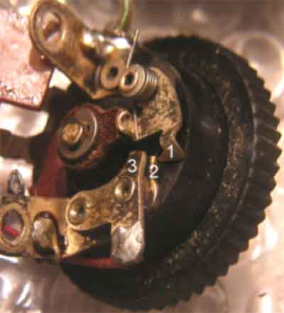 Der Schalter ist also was besonderes. Am vergrößerten Bild erkennt man den "Nasenkeil" 1 zum Lautsprecher, der mit 2 und 3 (Batterie A Minuspol und Batterie B Pluspol) beim Einschalten verbunden wird. Wenn man so einen Poti mit Schalter isoliert betrachten würde, fällt eine Anwendung dafür zu erkennen nicht leicht. Auf diese Schaltung muss man erstmal kommen!