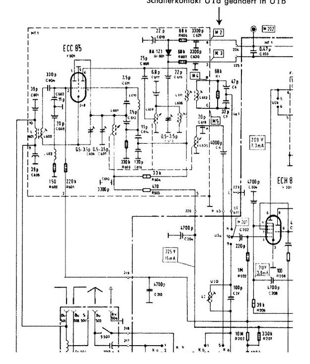 Danach mit mit allen 3 Möglichkeiten L602,C606,C607 auf bestmöglichen Empfang abgeglichen. (M207 als Referenz ca. 6V wie im Manual) Mit dem Meßsender habe ich dann kein kreischen über Band ! Die Störung schaffte es wohl nicht durch mein Meßkabel... Aber wenn die Antenne wieder dran ist, dann geht es wieder los. Die ist ja auch nur Draht. Nun habe ich wirklich minimalste Korrekturen vorgenommen; also Sender unten bis Sender oben geprüft und C607 und C606 etwas verstellt. Dabei merkt man dann, das der Bereich des störungsfreien Empfang breiter oder schmaler wird. Auf einmal kommt der Punkt, wo das Teil auf einen Schlag richtig in Fahrt kommt und sauempfindlich wird und dann kann man die Störung durch wirklich minimalste Korrektur des C606 weg bekommen. Die L602 ist kaum von Bedeutung aber es geht am besten , wenn der Kern nur minimal eingedreht ist etwa 3 Umdrehungen. Der C606 kommt wie auch vorgefunden am unterstem Anschlag zu Einsatz. Kurz vor dem rausfallen.