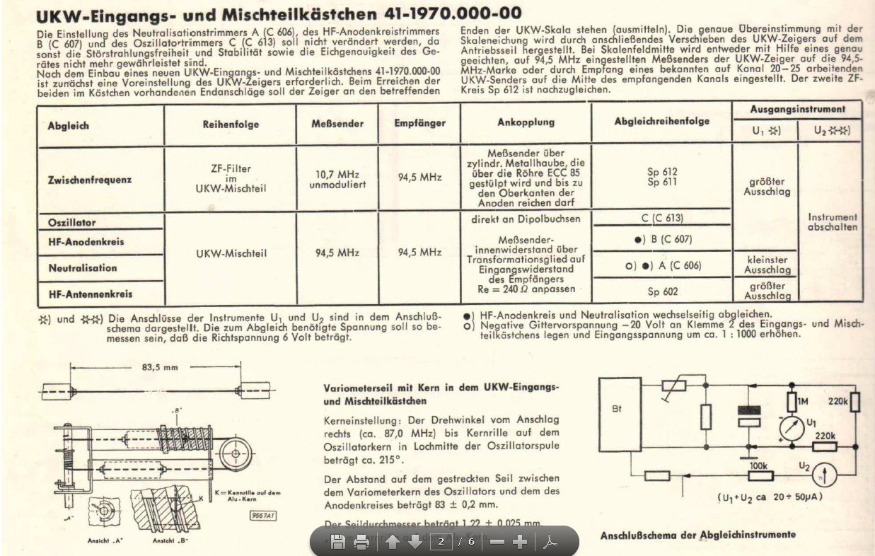 ich habe eine Abgleichanleitung für das Kästchen 41-1970.000-00 vorliegen. Hier ist der Neutralisationstrimmer C606. Sinngemäß steht dazu folgendes: - Messender auf 94,5 MHz einstellen - Empfänger auf 94,5 MHz einstellen - Ankoppelung des Signals über die Dipolbuchsen (240 Ohm) - Spannungsmesser an Pin2 der EABC 80 a) - Spannung von -20 Volt an Pin 2 des Mischteils anschließen (damit wird die Vorstufe zugeregelt und somit wirkungslos) - Spannung am Messender erhöhen, damit wieder ein Ausschlag am Voltmeter sichtbar wird - C606 auf Minimum am Voltmeter abgleichen - 20 Volt von Pin 2 lösen - Spannung am Messender verringern - C607 auf Maximum abgleichen Wieder nach a) solange, bis keine Verbesserung mehr möglich ist.